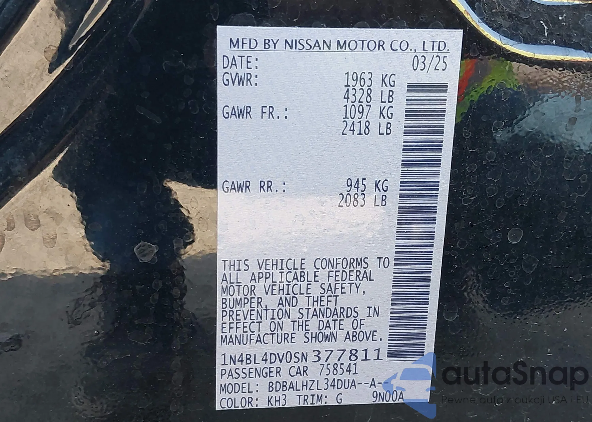 LOT: 43261943 VIN: 1N4BL4DV0SN377811