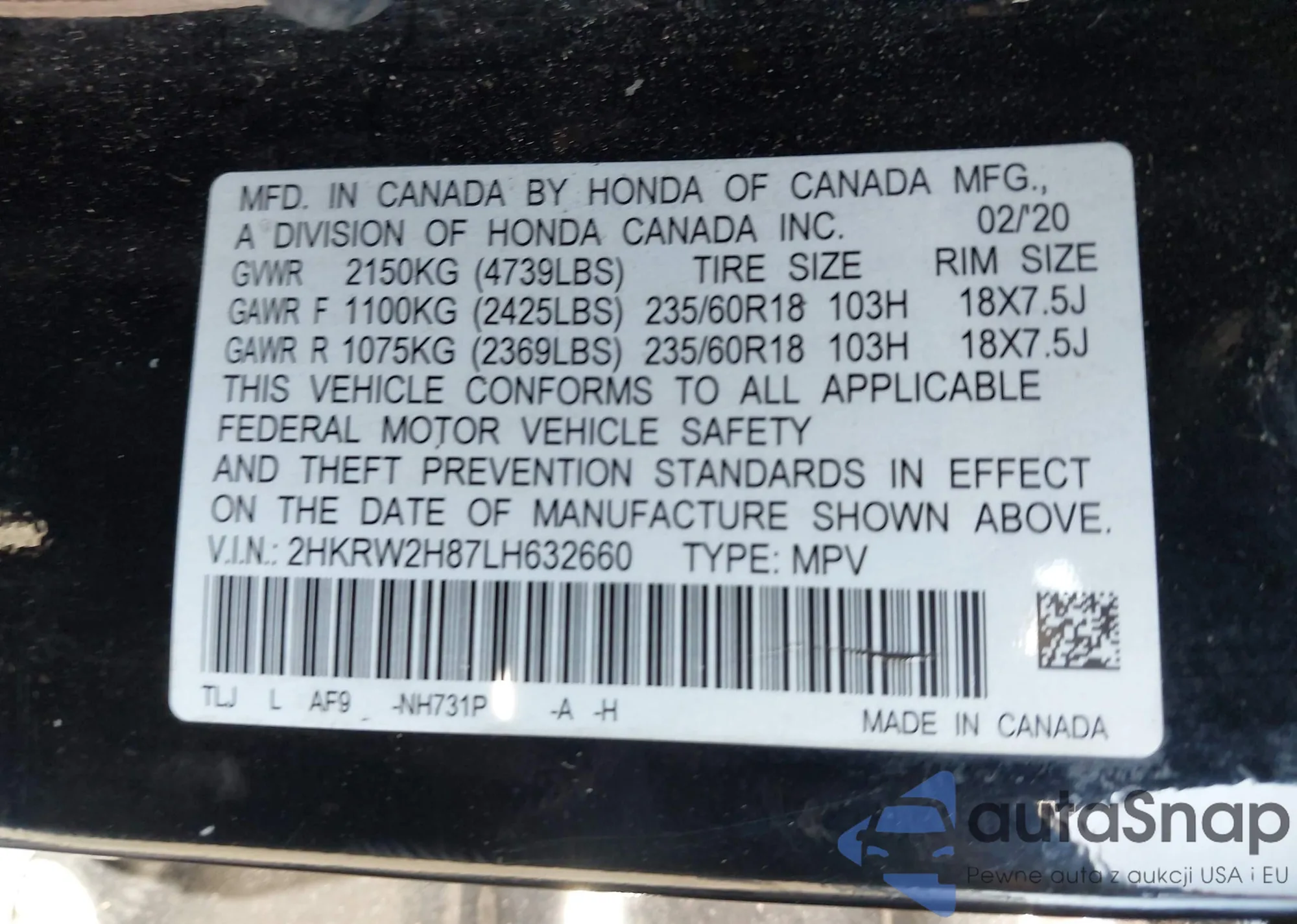 • VIN 2HKRW2H87LH632660