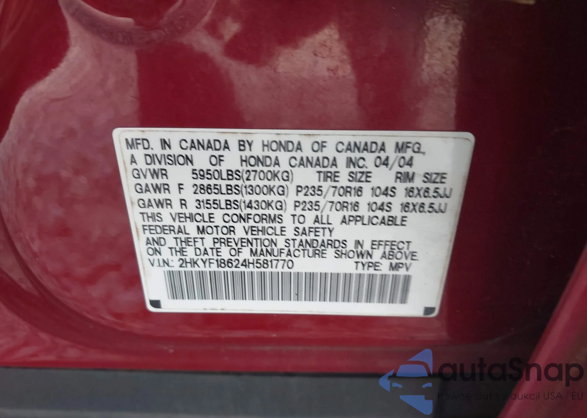 • VIN 2HGFG3B54DH507258