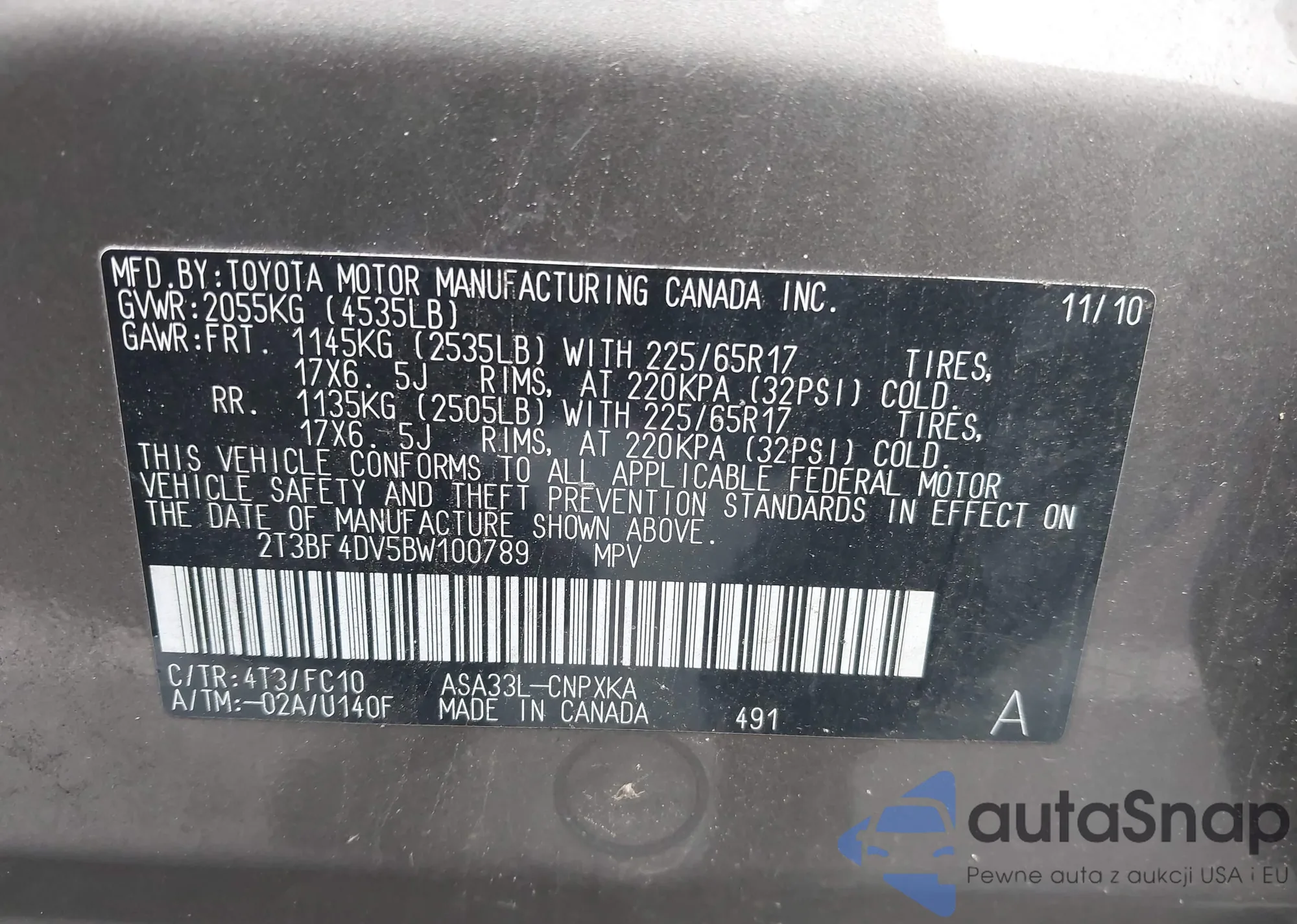 • VIN 2T3BF4DV5BW100789