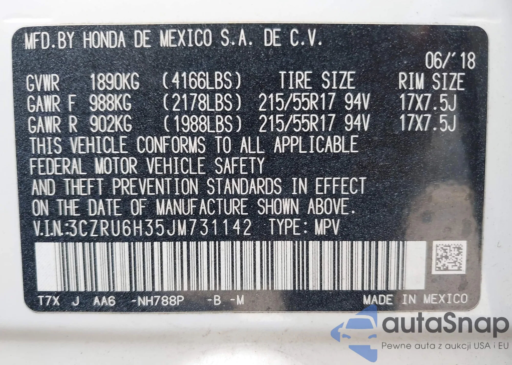 • VIN 3CZRU6H35JM731142