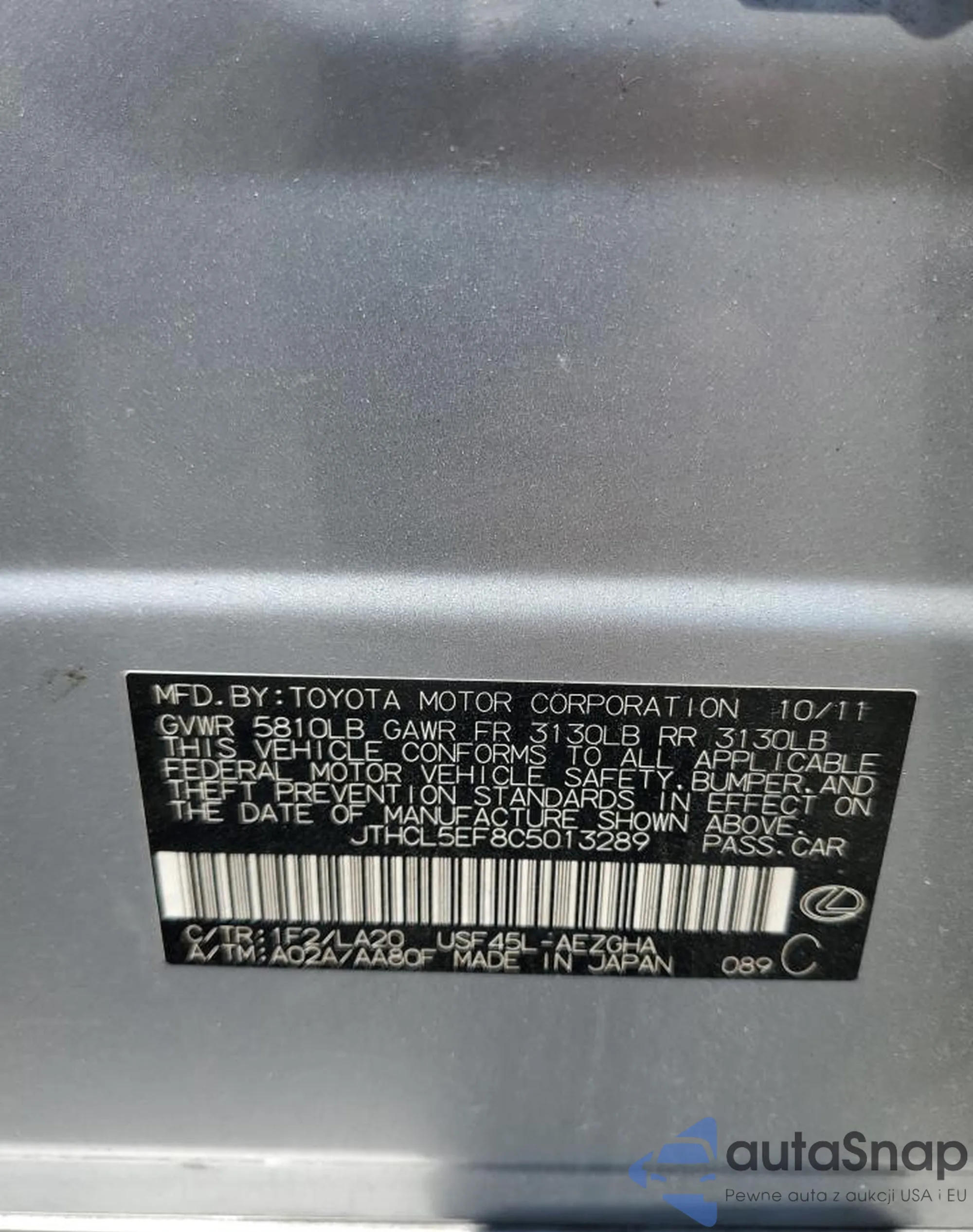 • VIN JTHCL5EF8C5013289