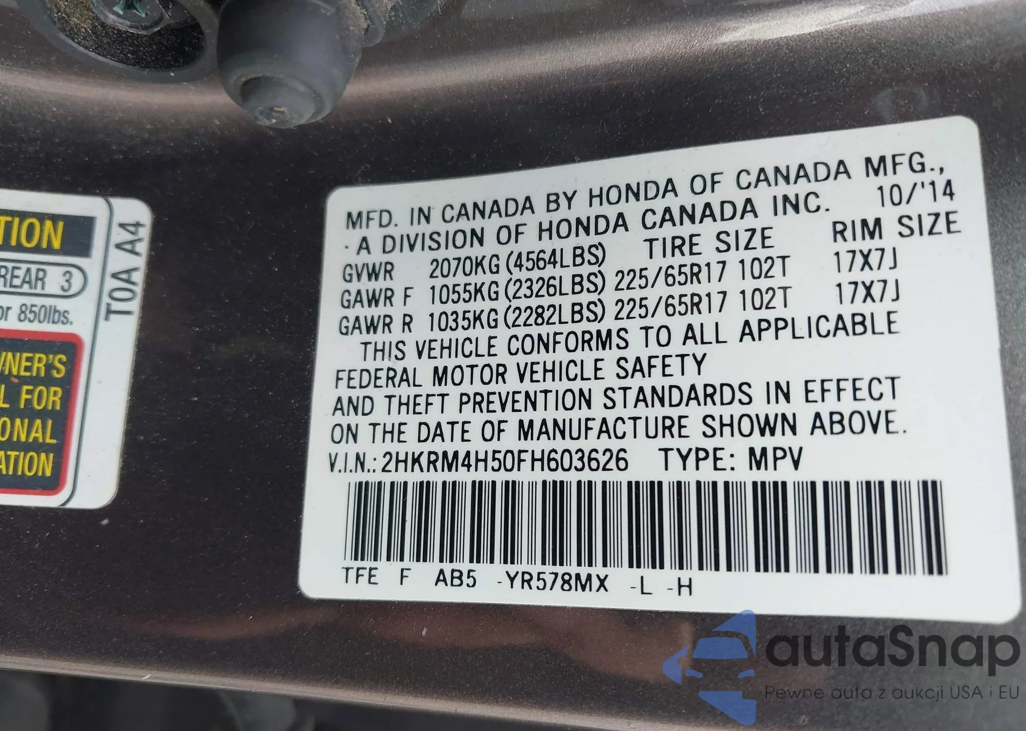 • VIN 2HKRM4H50FH603626