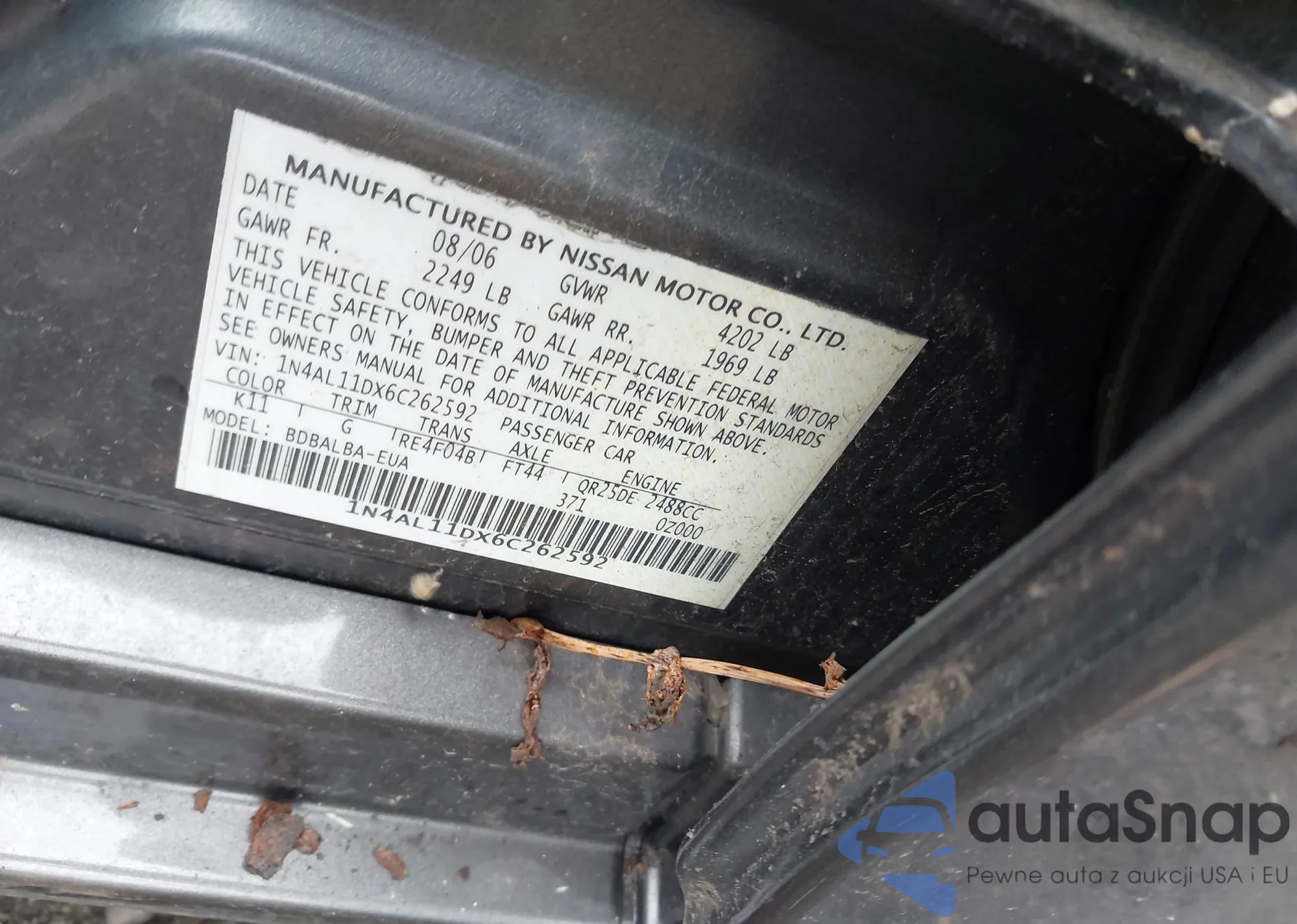2006 Nissan Altima 2.5 S z USA, uszkodzony, nr VIN 1N4AL11DX6C262592