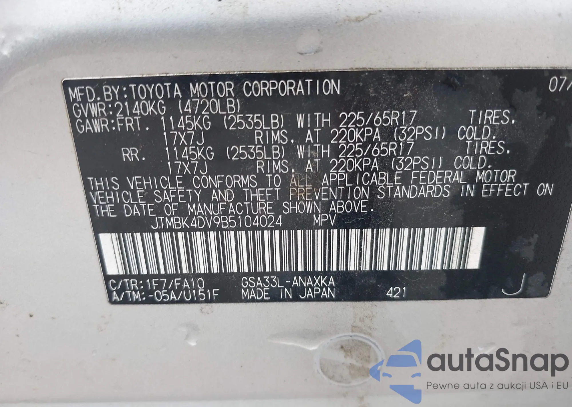 LOT: 43187149 VIN: JTMBK4DV9B5104024