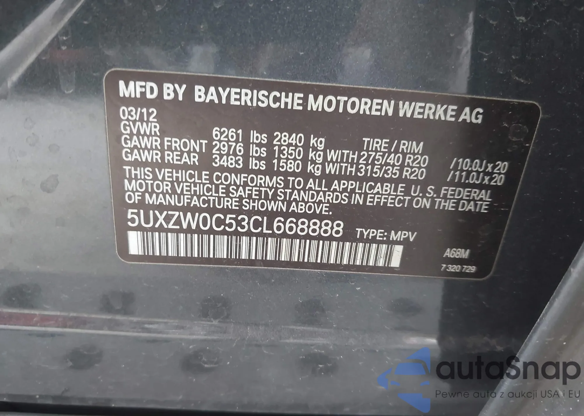 • VIN 5UXZW0C53CL668888