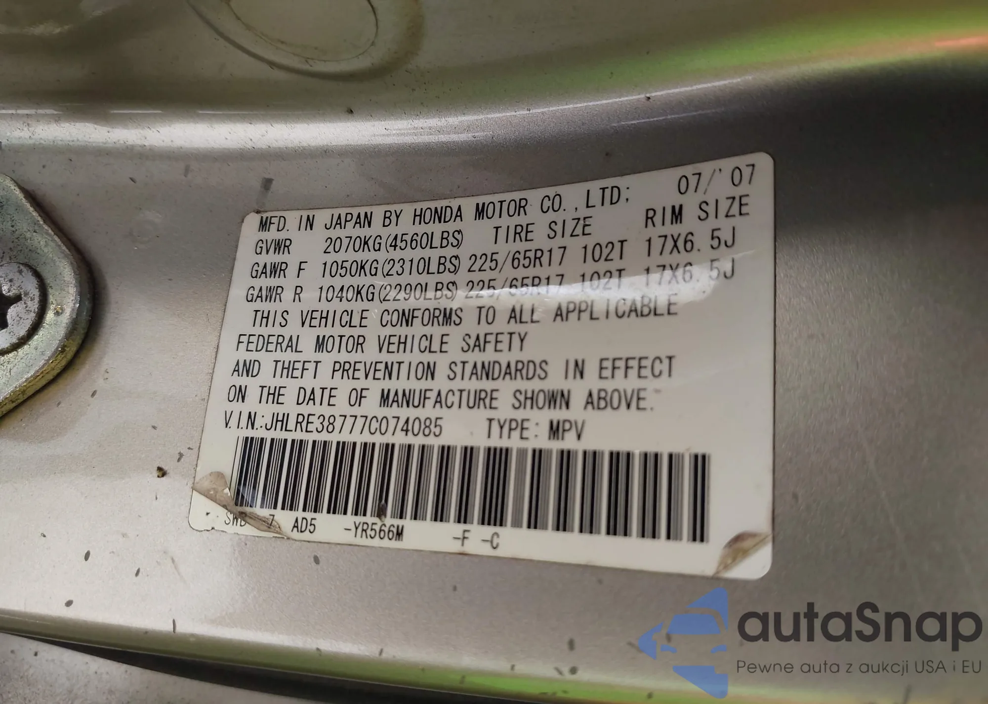 LOT: 43157506 VIN: JHLRE38777C074085