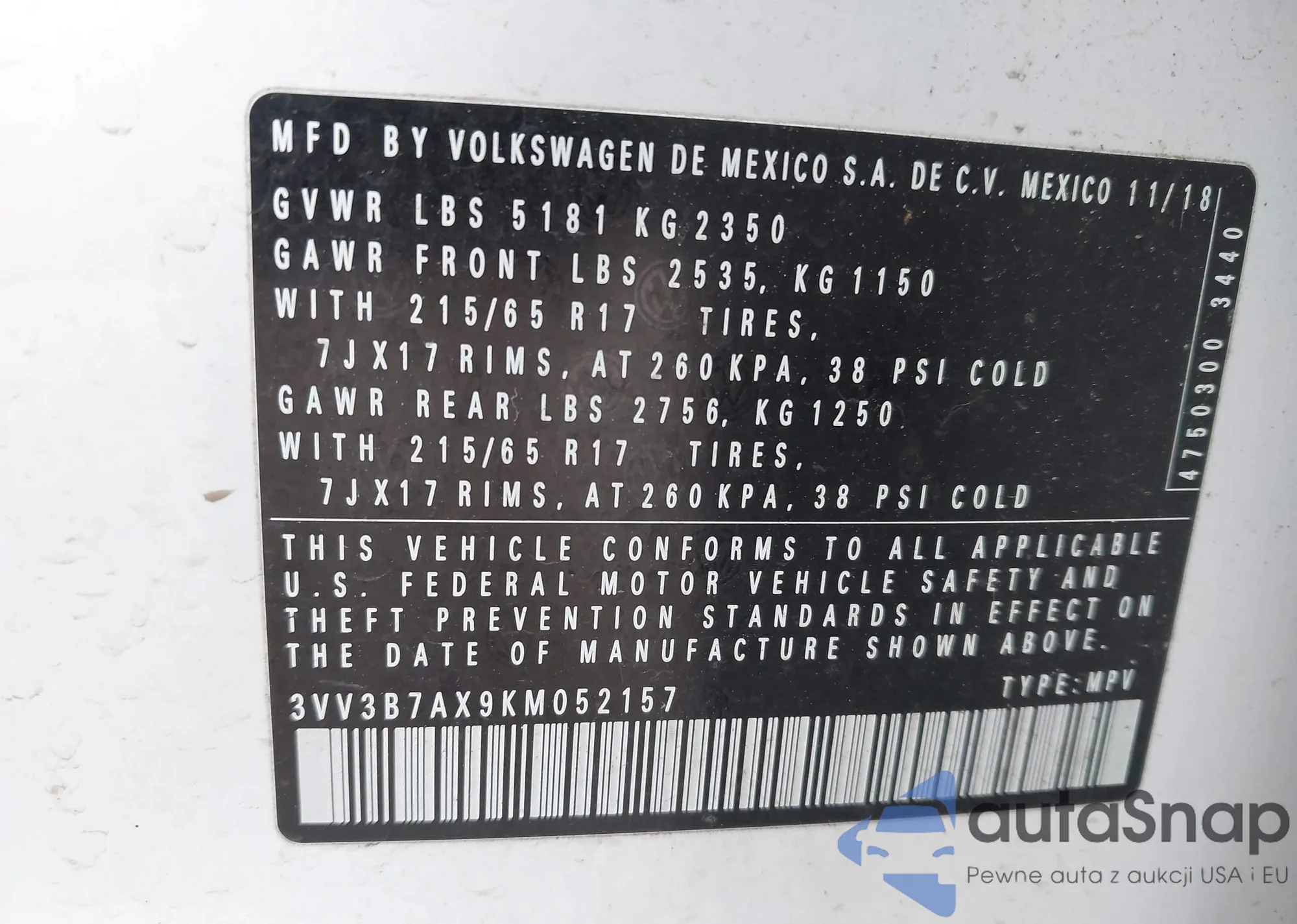 LOT: 43177350 VIN: 3VV3B7AX9KM052157
