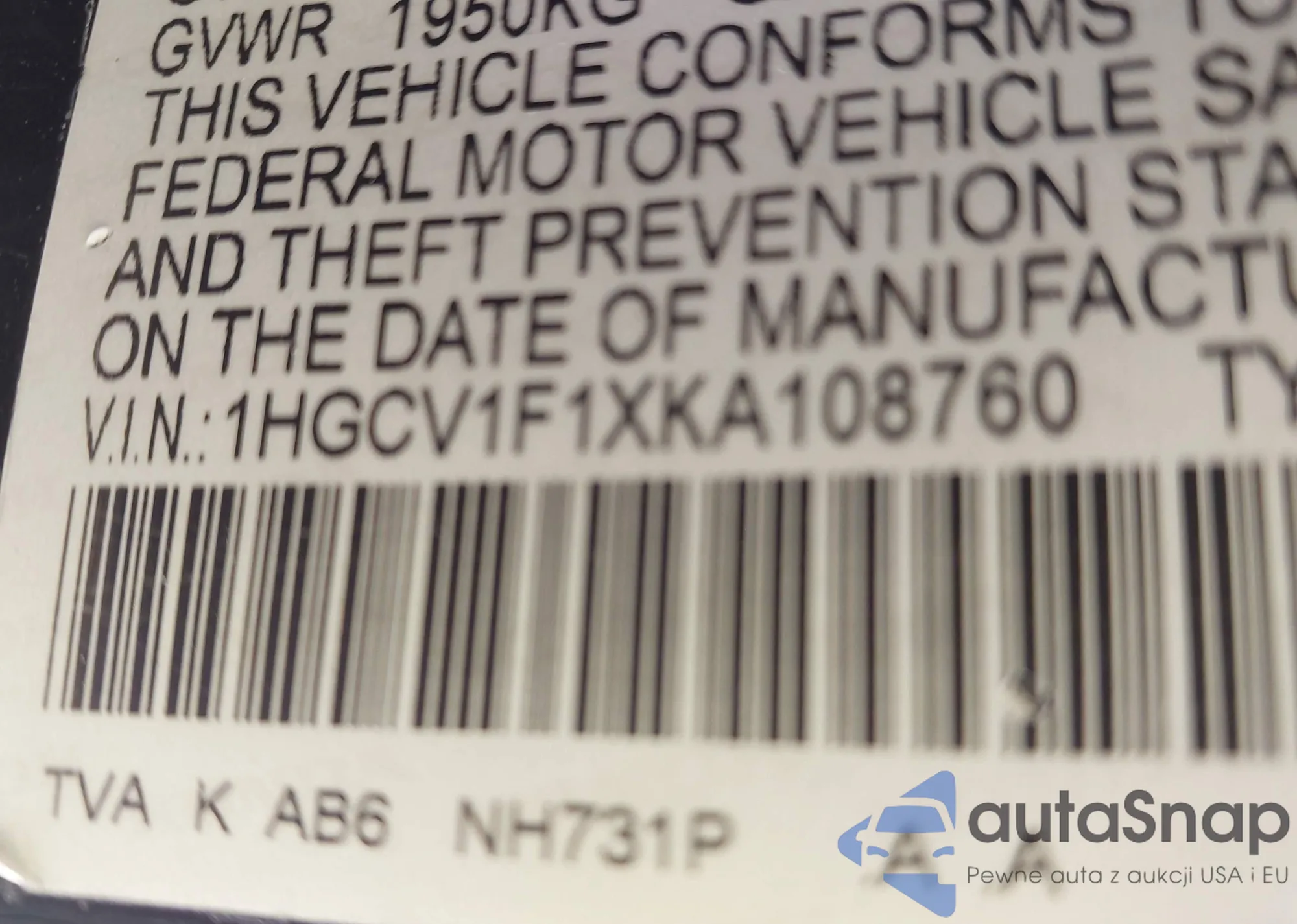 LOT: 43359908 VIN: 1HGCV1F1XKA108760