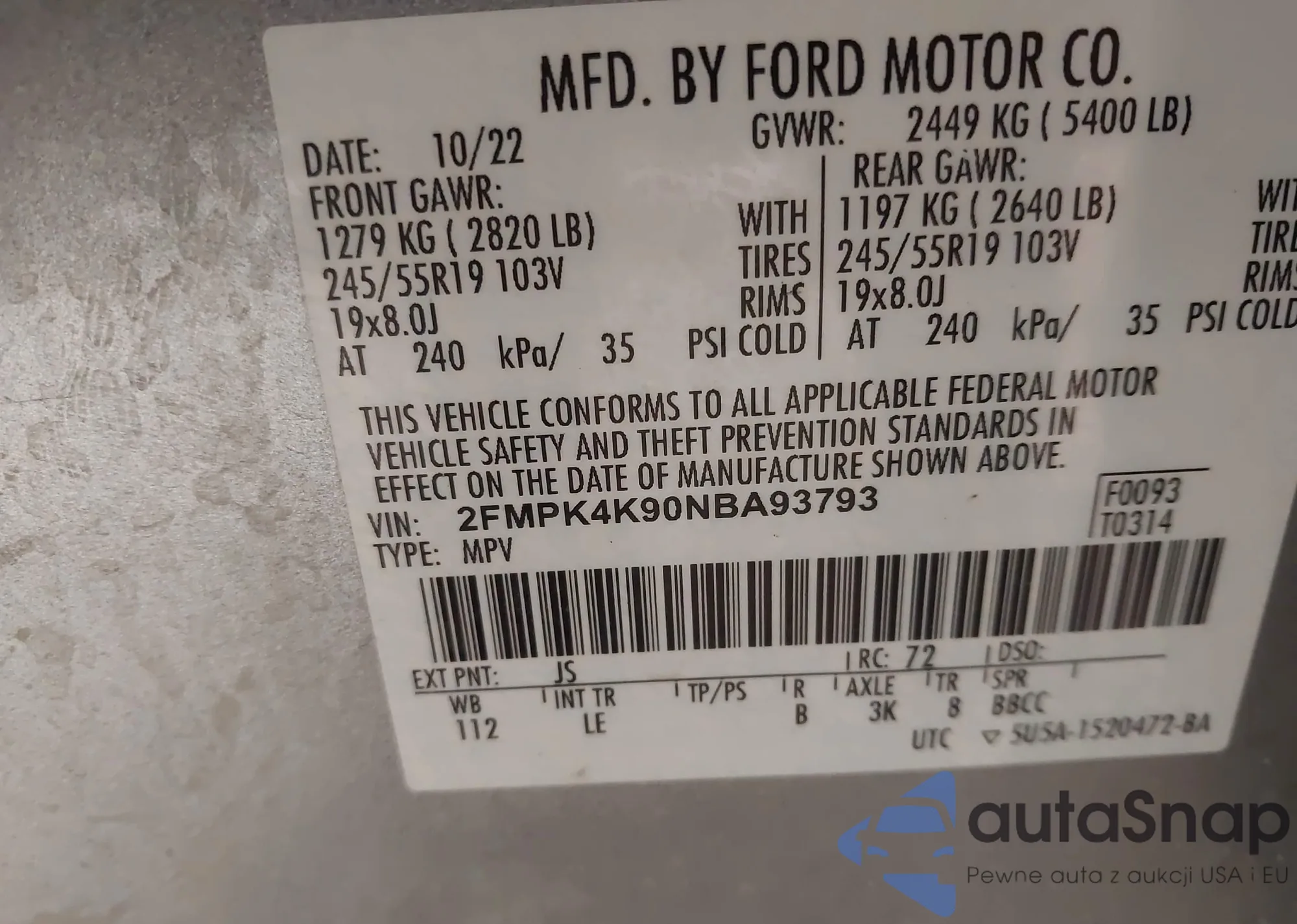 • VIN 2FMPK4K90NBA93793