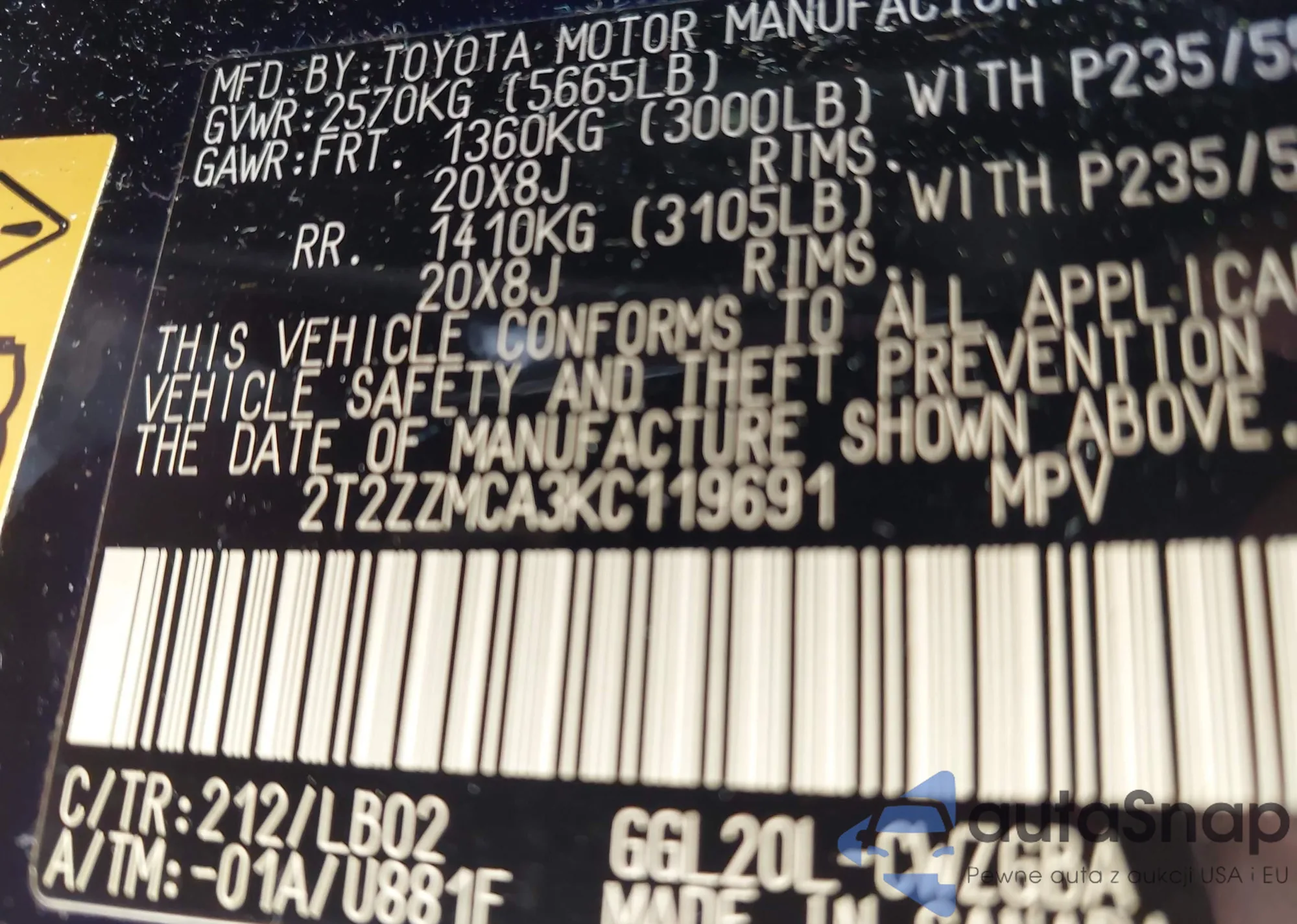 • VIN 2T2ZZMCA3KC119691