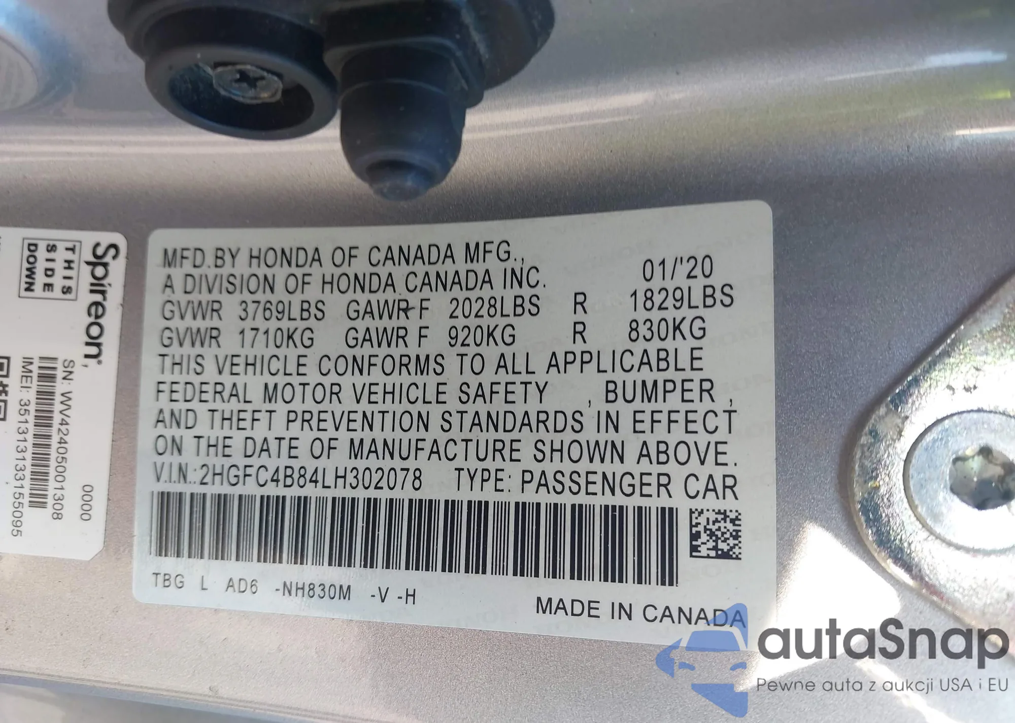 • VIN 2HGFC3B37KH356701