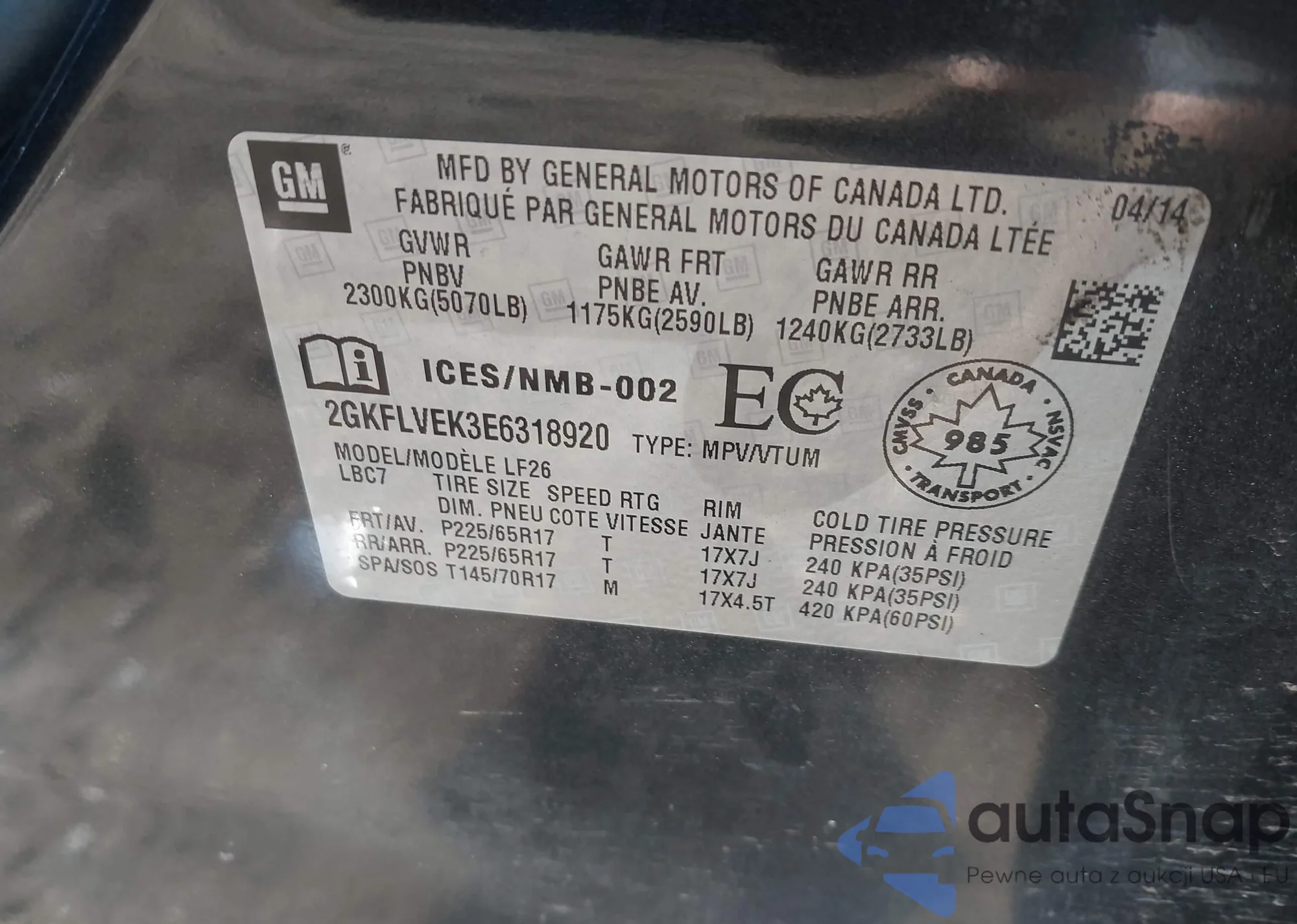 • VIN 2GKFLVEK3E6318920