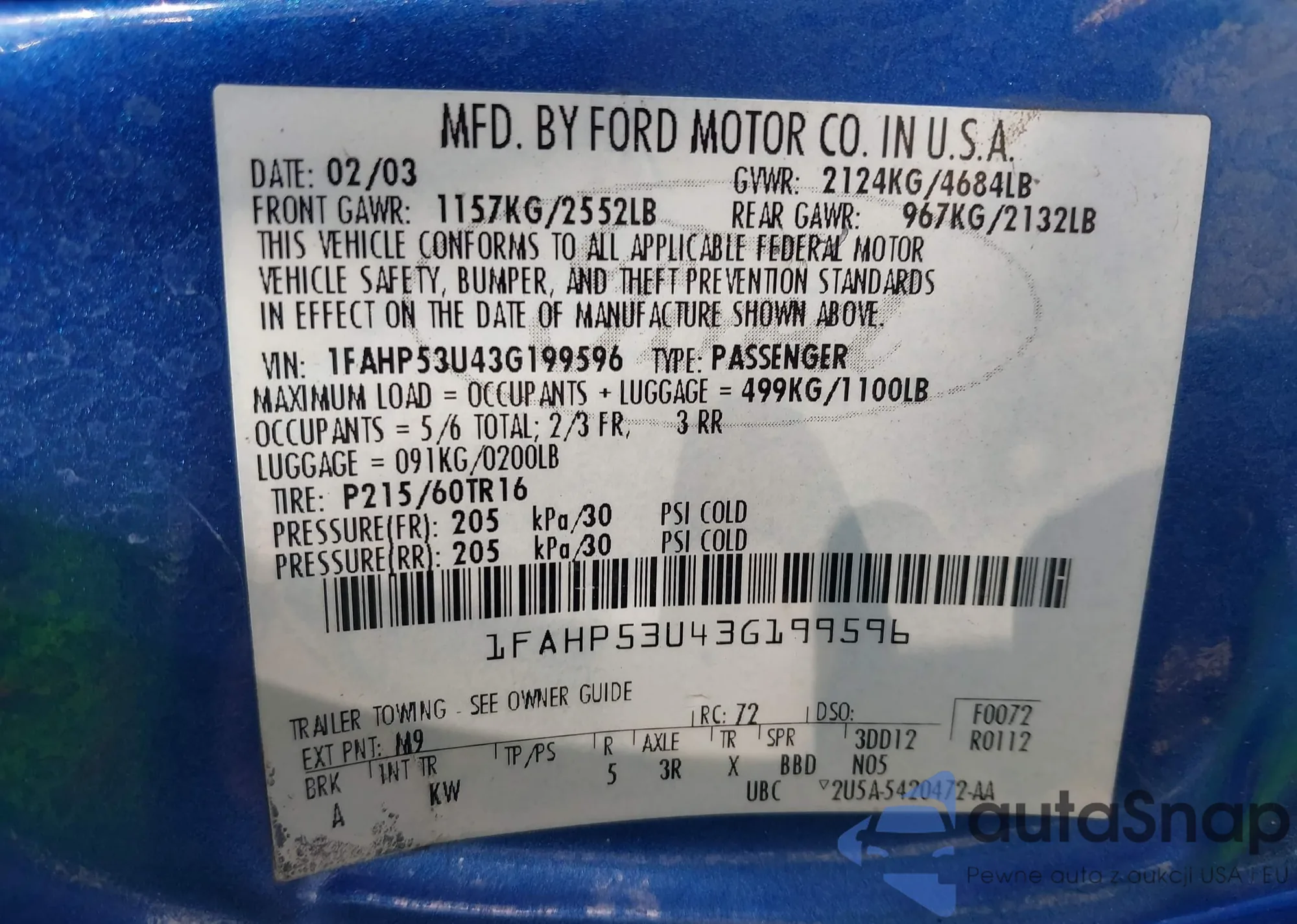 LOT: 42969718 VIN: 1FAHP53U43G199596