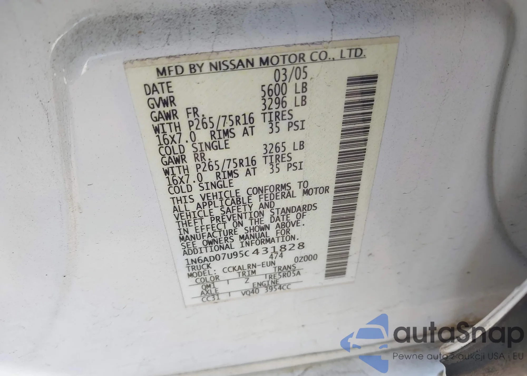 LOT: 43130373 VIN: 1N6AD07U95C431828