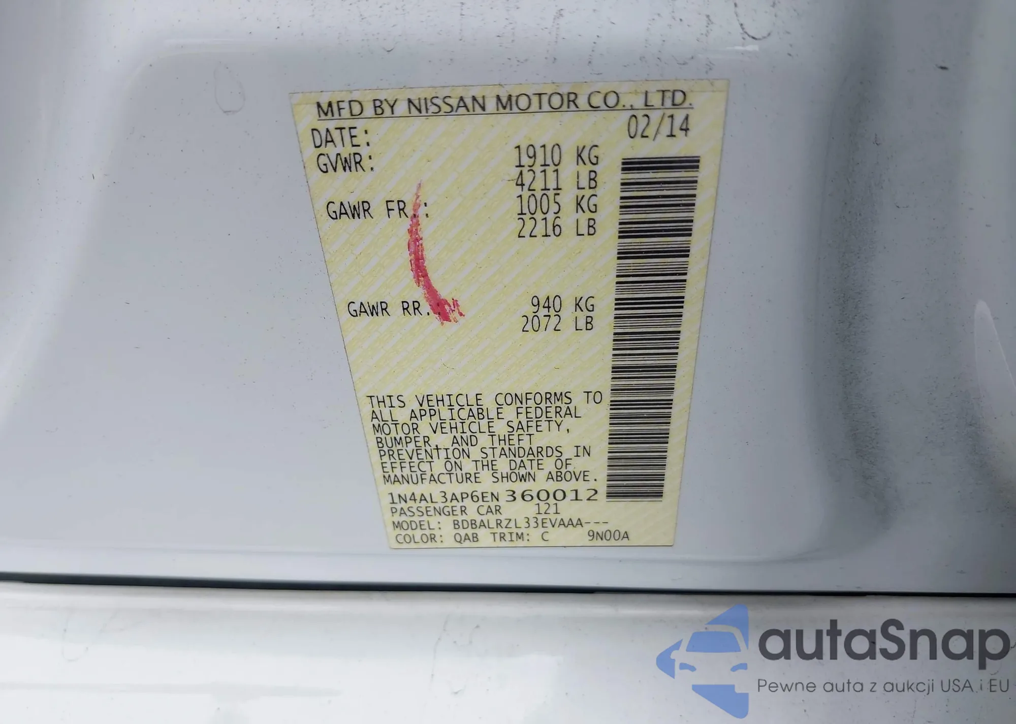 LOT: 43316982 VIN: 1N4AL3AP6EN360012