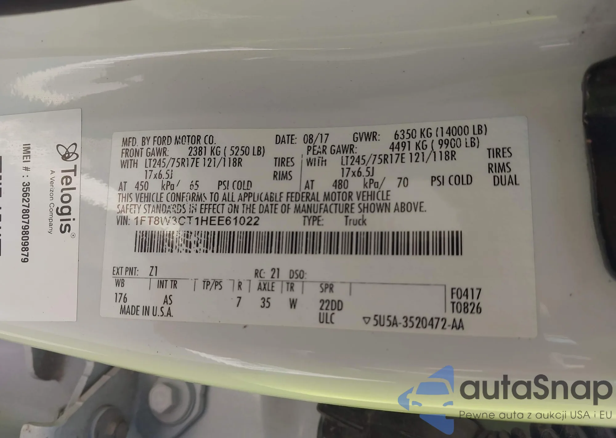 LOT: 43364953 VIN: 1FT8W3CT1HEE61022