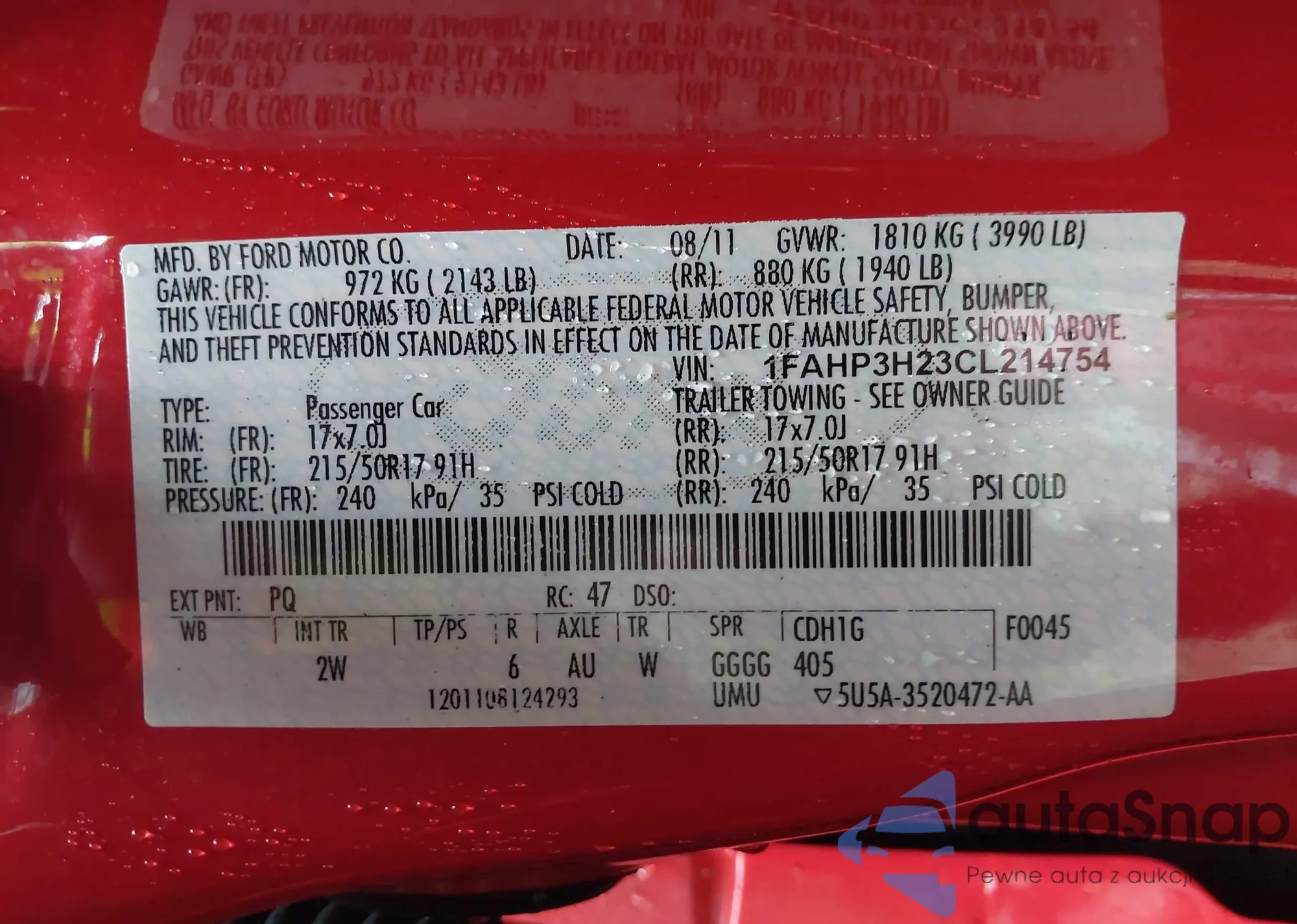 LOT: 43216631 VIN: 1FAHP3H23CL214754