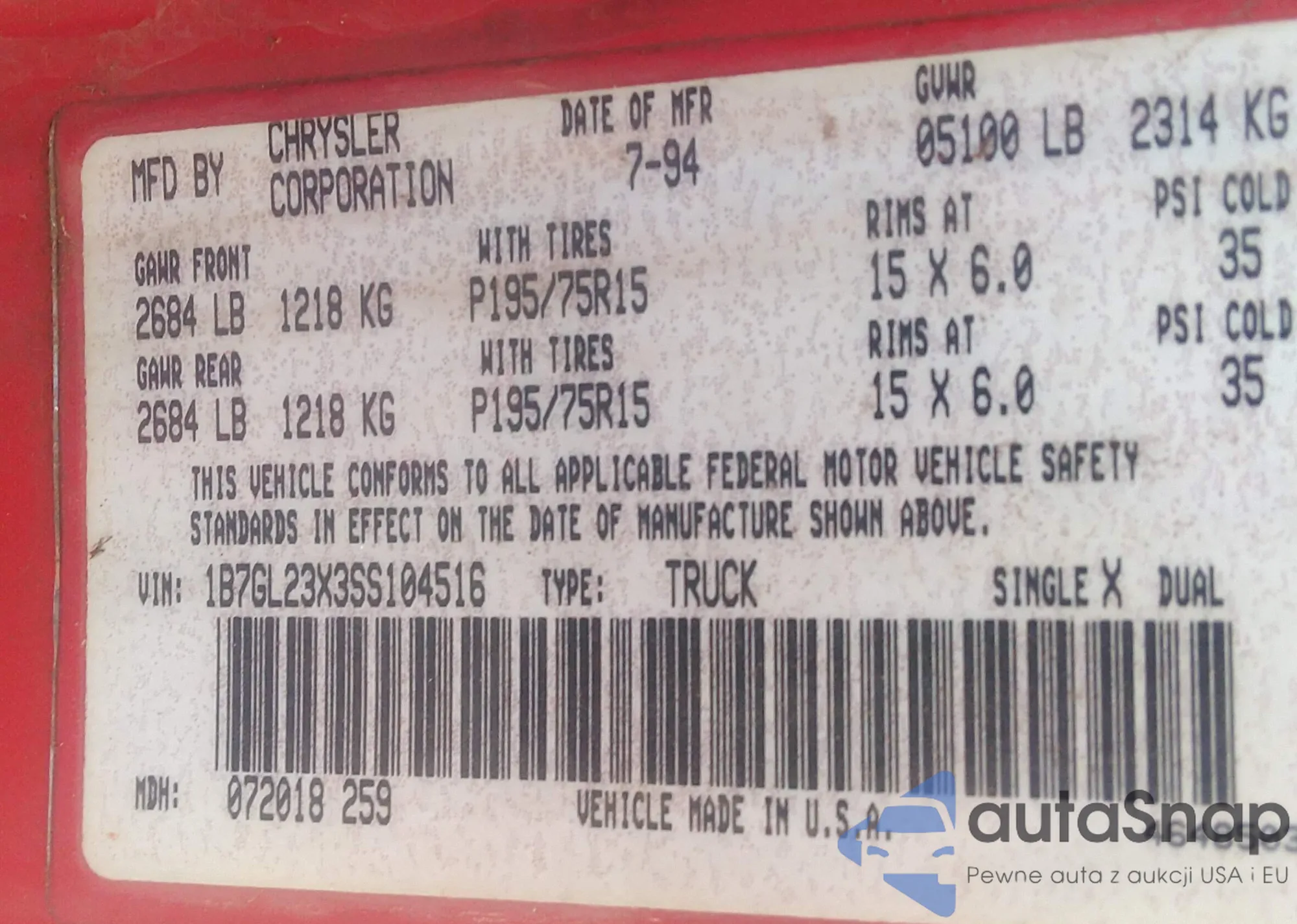 • VIN 1B7GL23X3SS104516