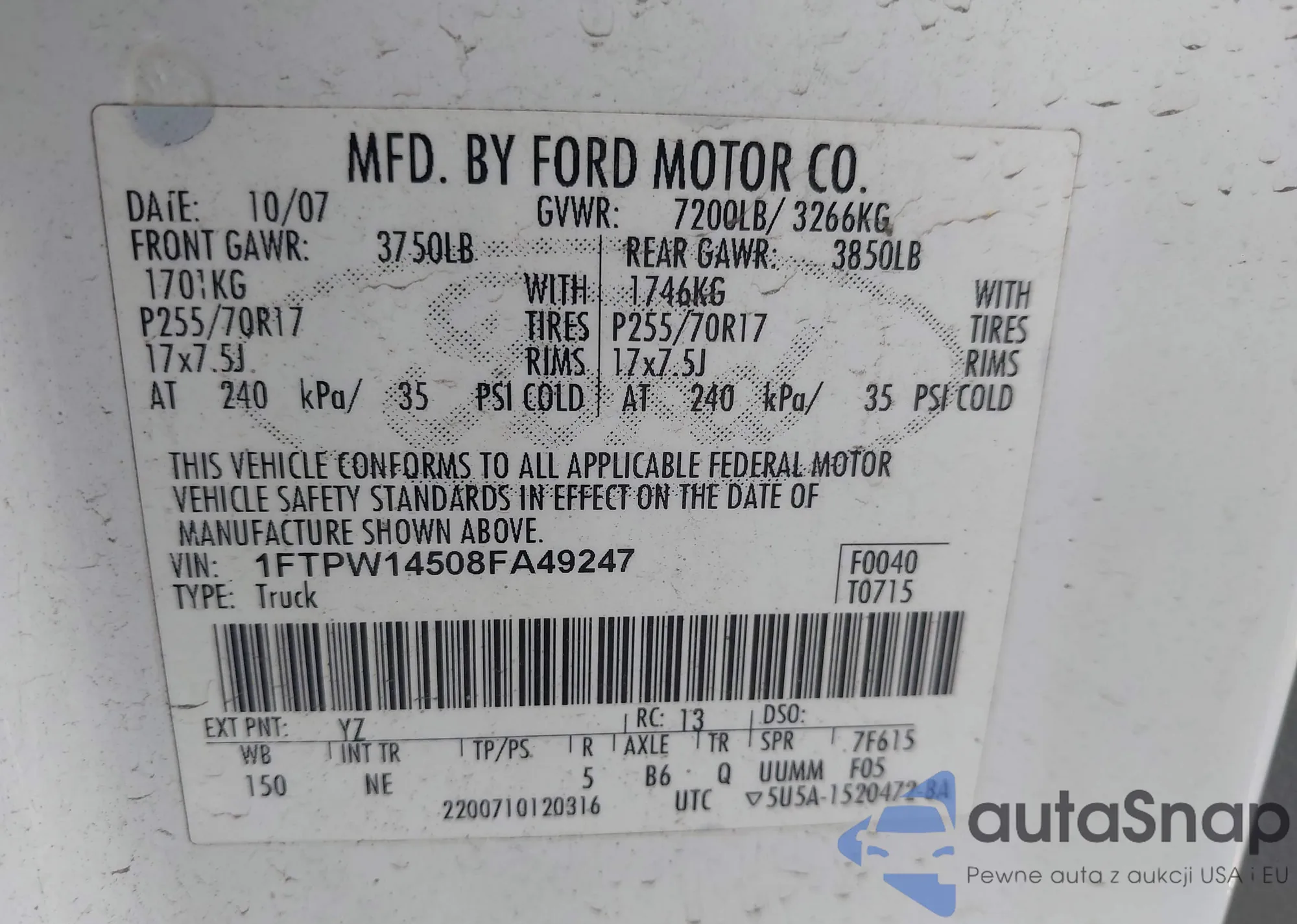 LOT: 43085611 VIN: 1FTPW14508FA49247