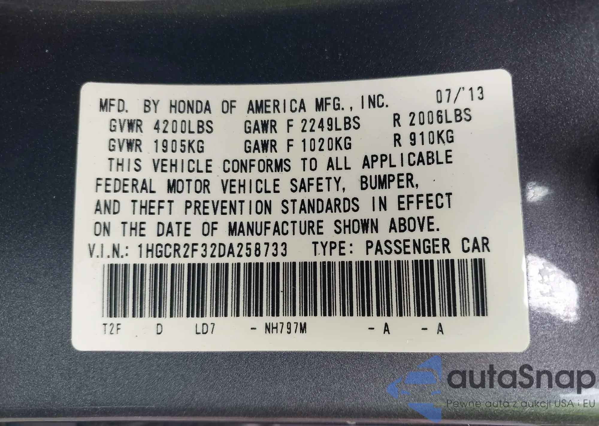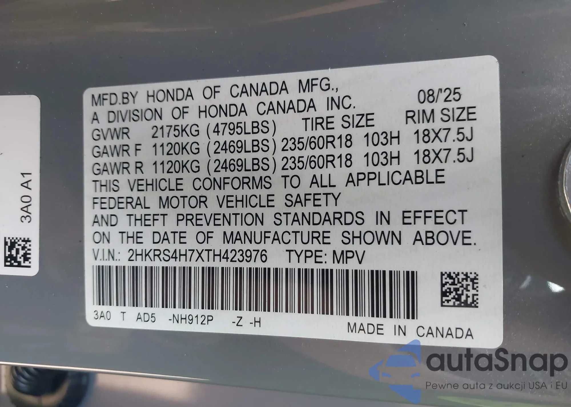 • VIN 2HKRS4H7XTH423976