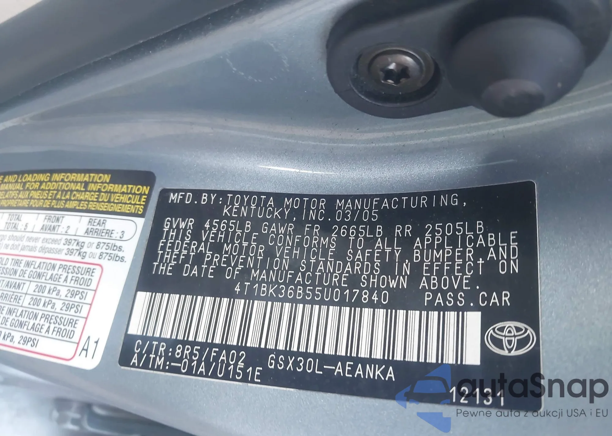 LOT: 43265025 VIN: 4T1BK36B55U017840