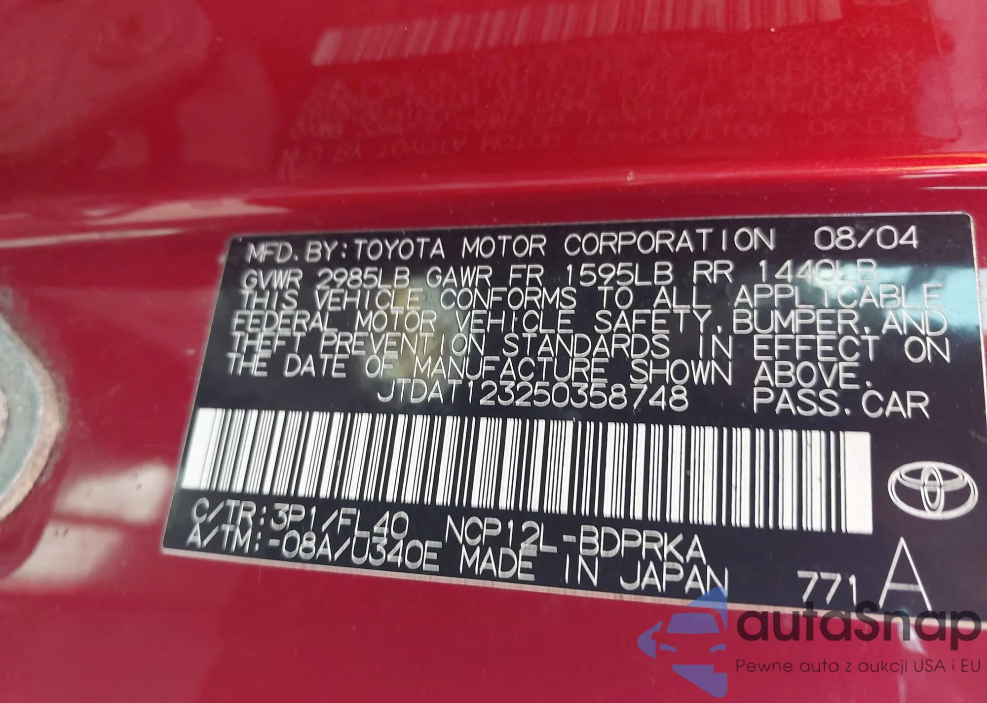 LOT: 43270985 VIN: JTDAT123250358748