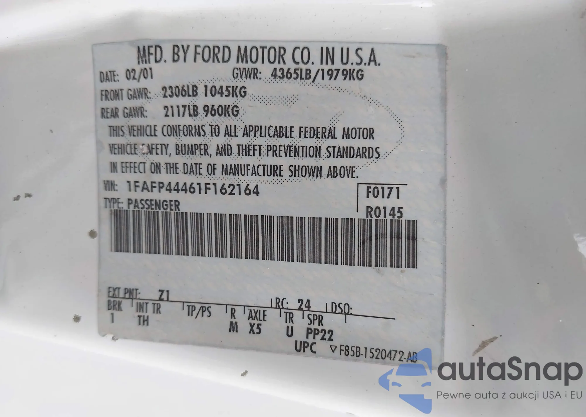 • VIN 1FAFP44461F162164