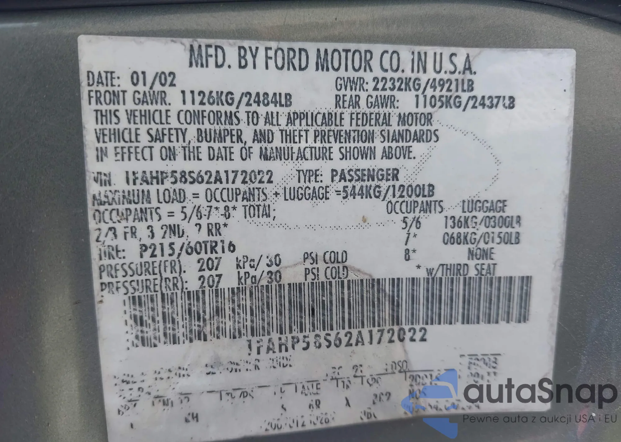LOT: 43100963 VIN: 1FAHP58S62A172022
