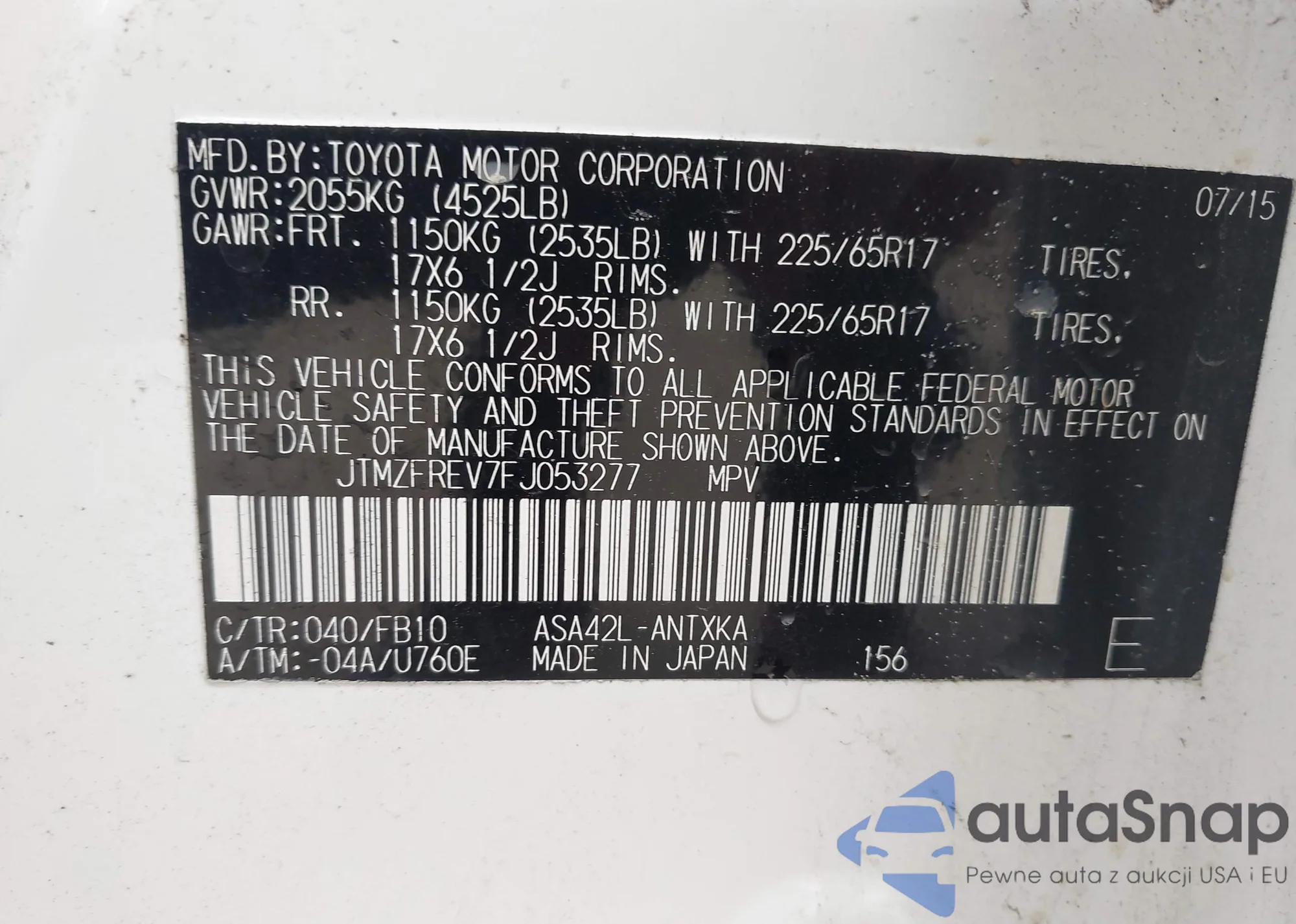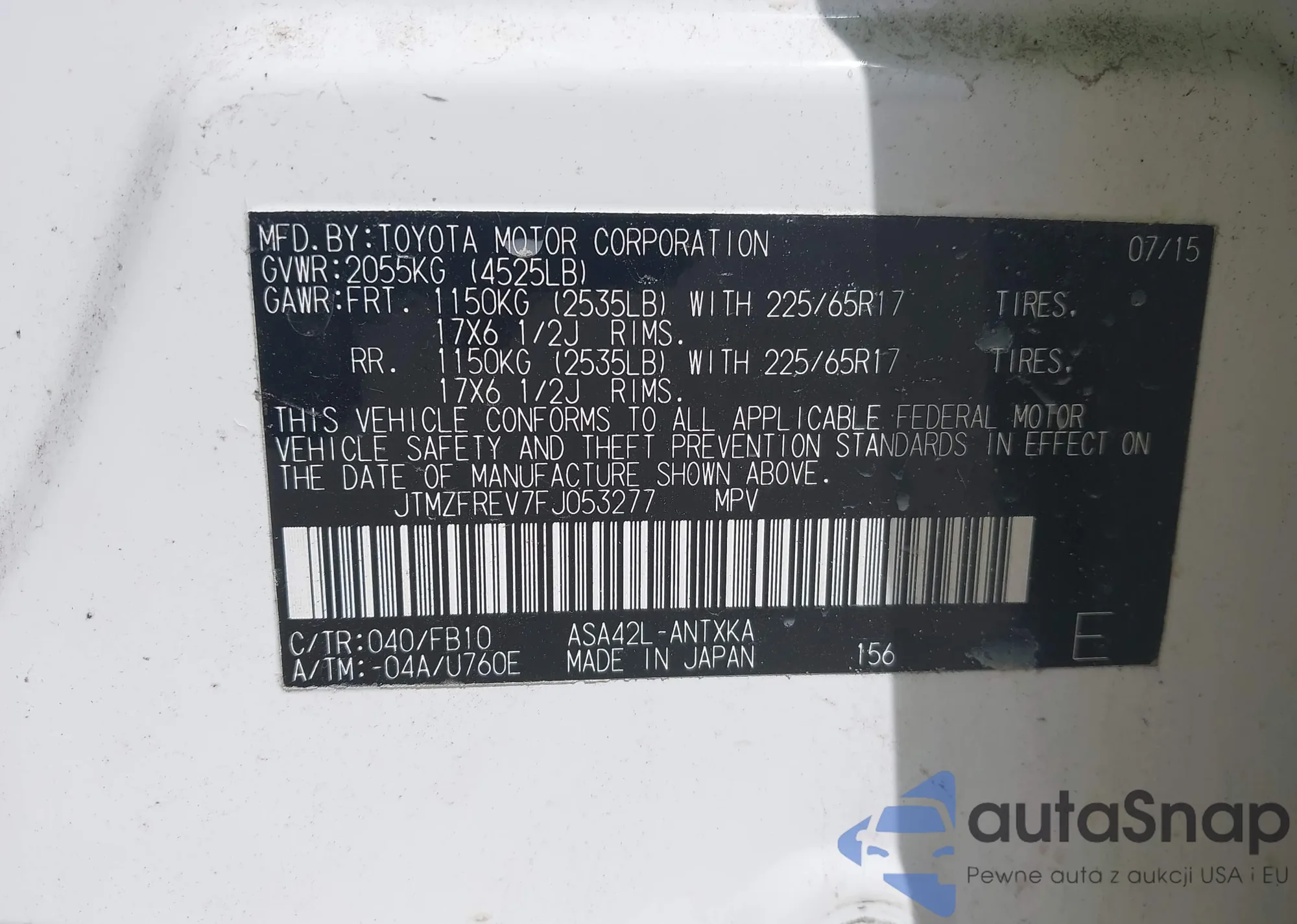 LOT: 43203537 VIN: JTMZFREV7FJ053277