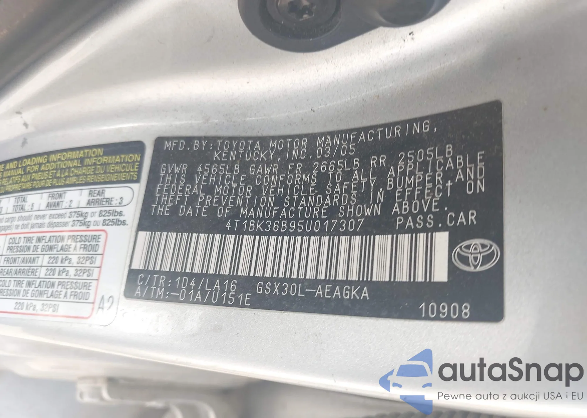 LOT: 43196778 VIN: 4T1BK36B95U017307