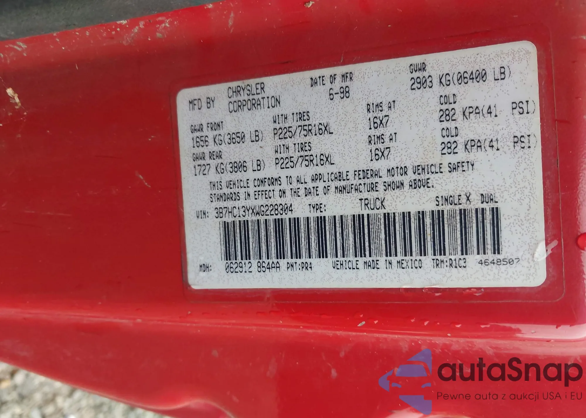• VIN 3B7HC13YXWG228304