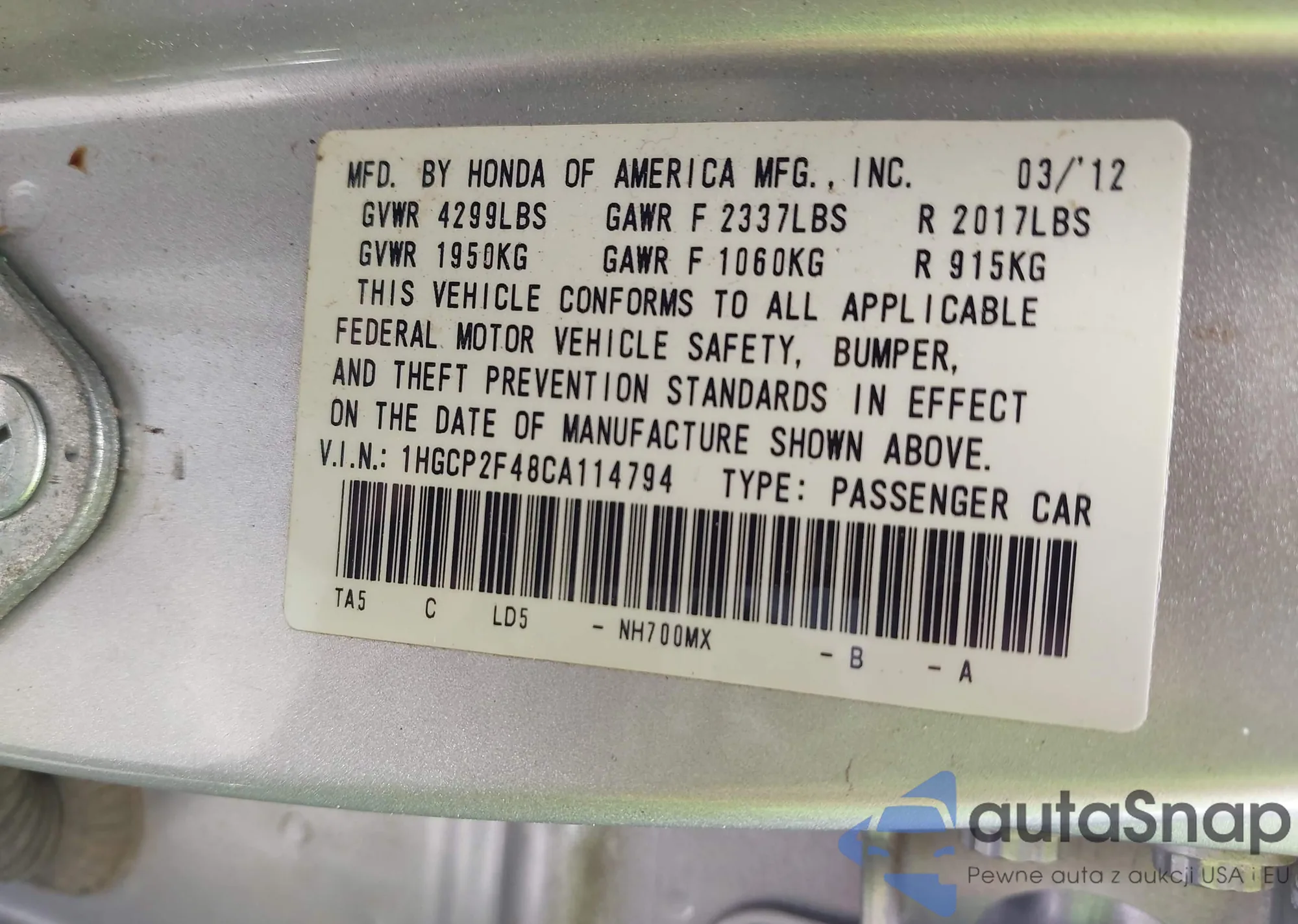 • VIN 1HGCP2F48CA114794