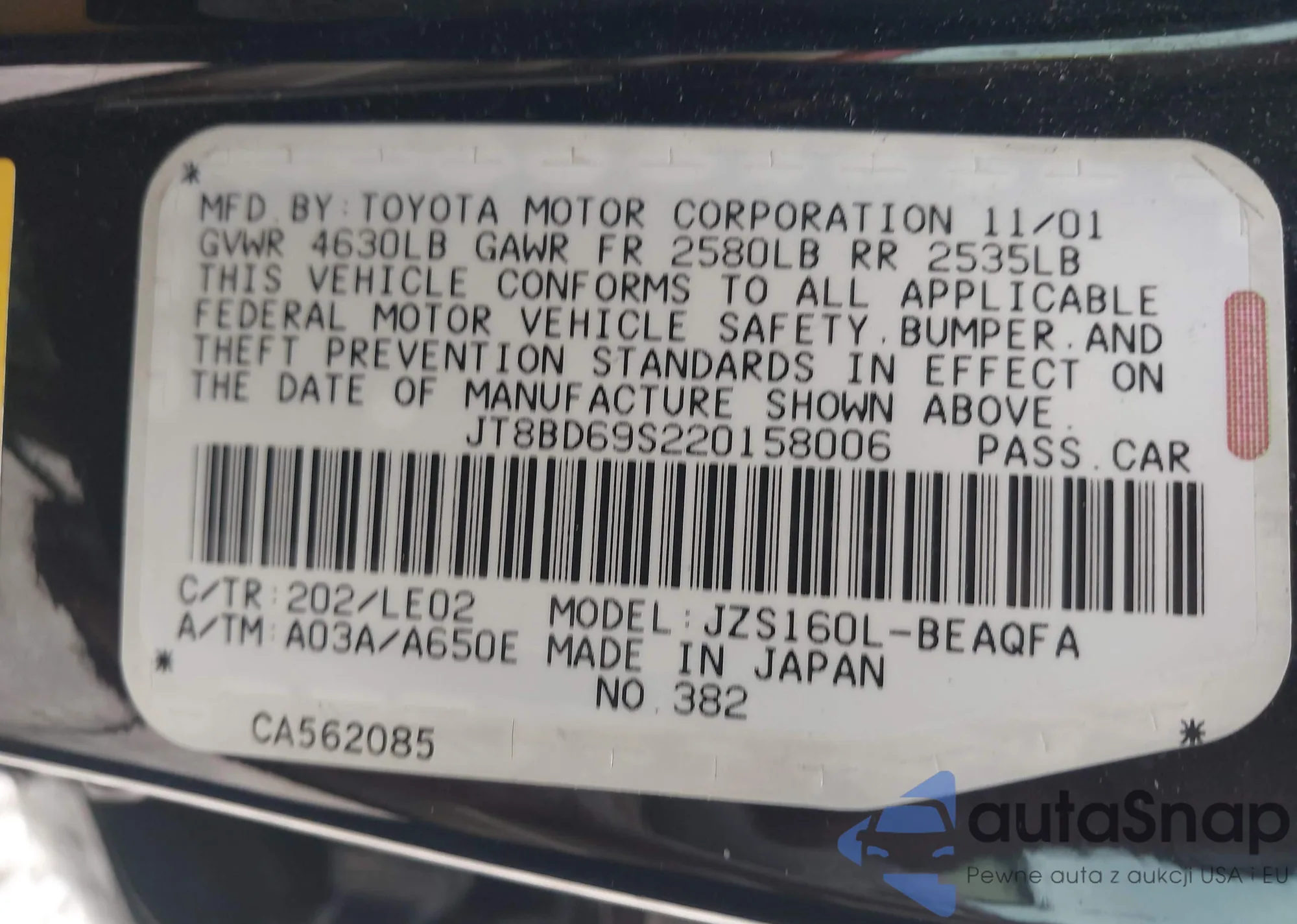 LOT: 43086271 VIN: JM1BJ2226Y0228628