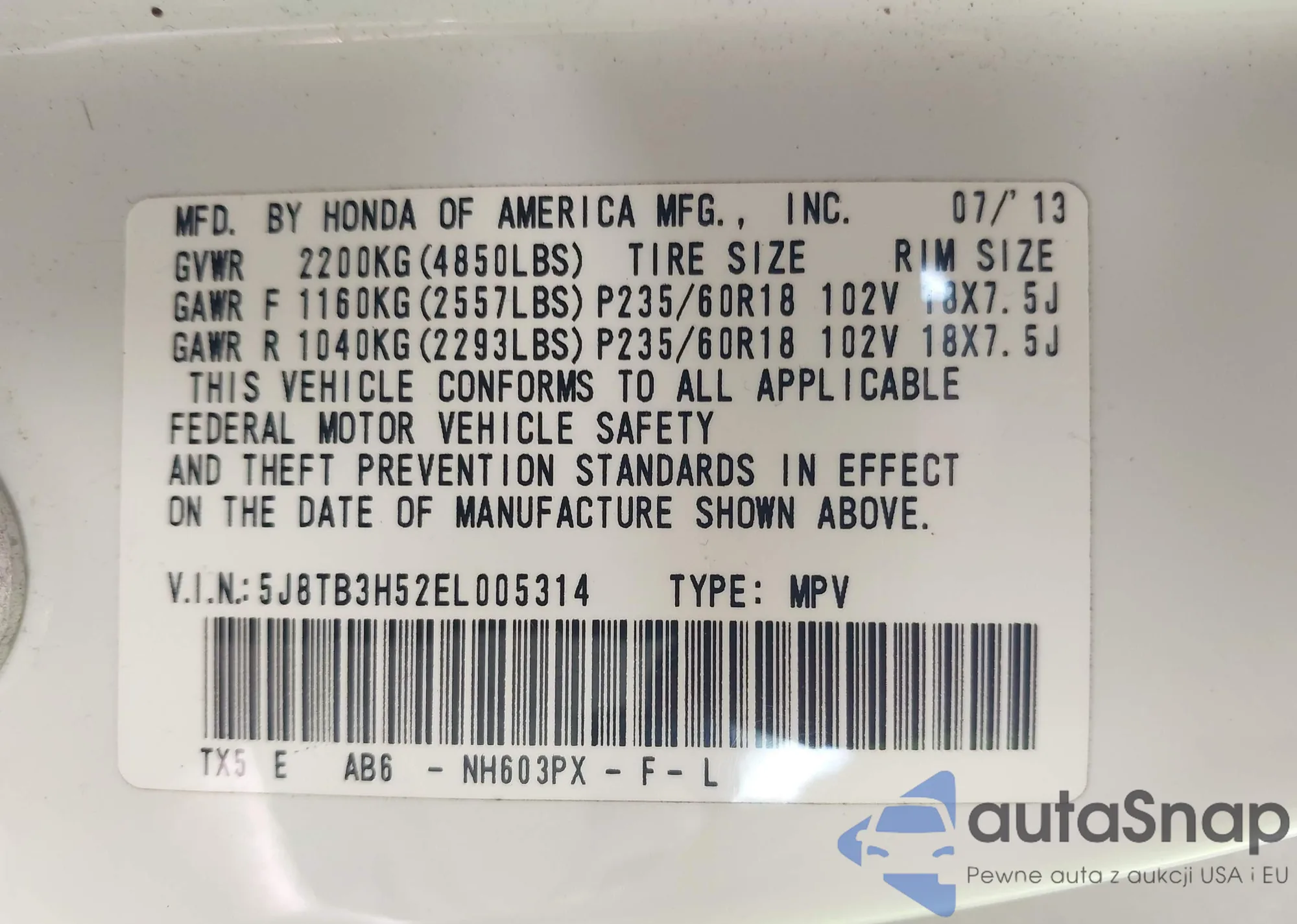 • VIN 5J8TB3H52EL005314