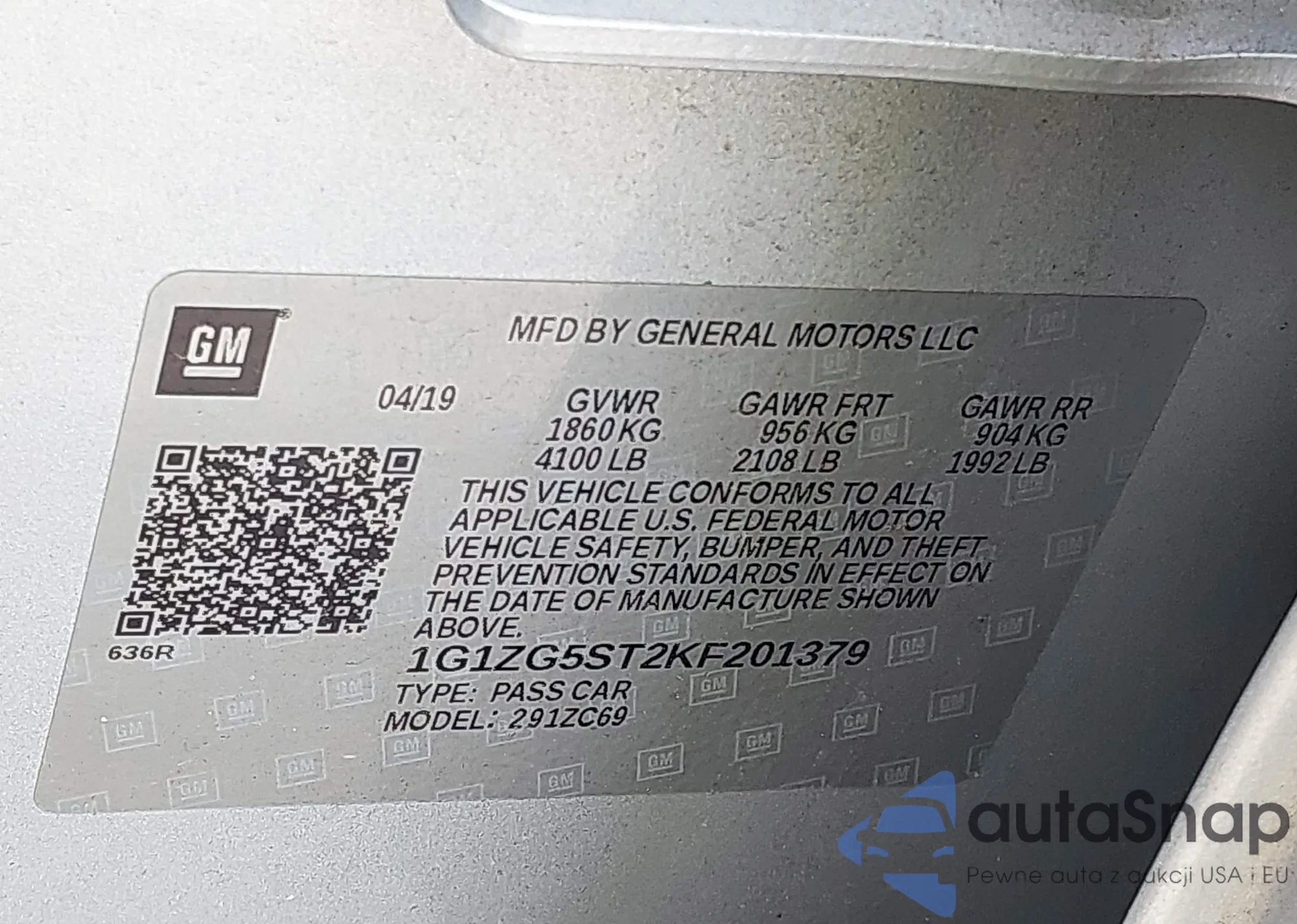 • VIN 1G1ZG5ST2KF201379