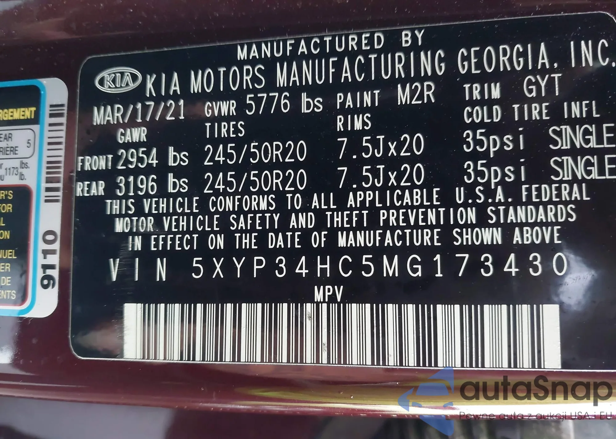 • VIN 5XYP34HC5MG173430