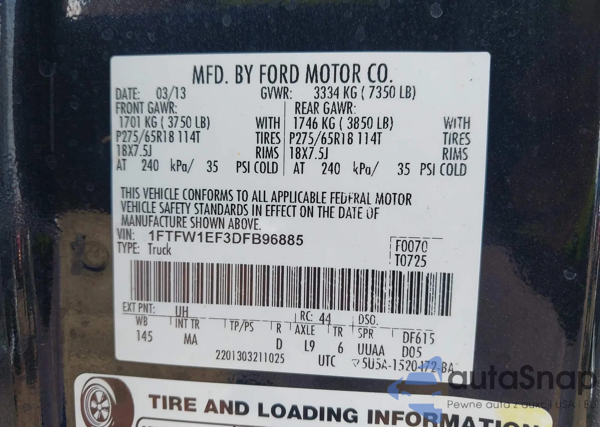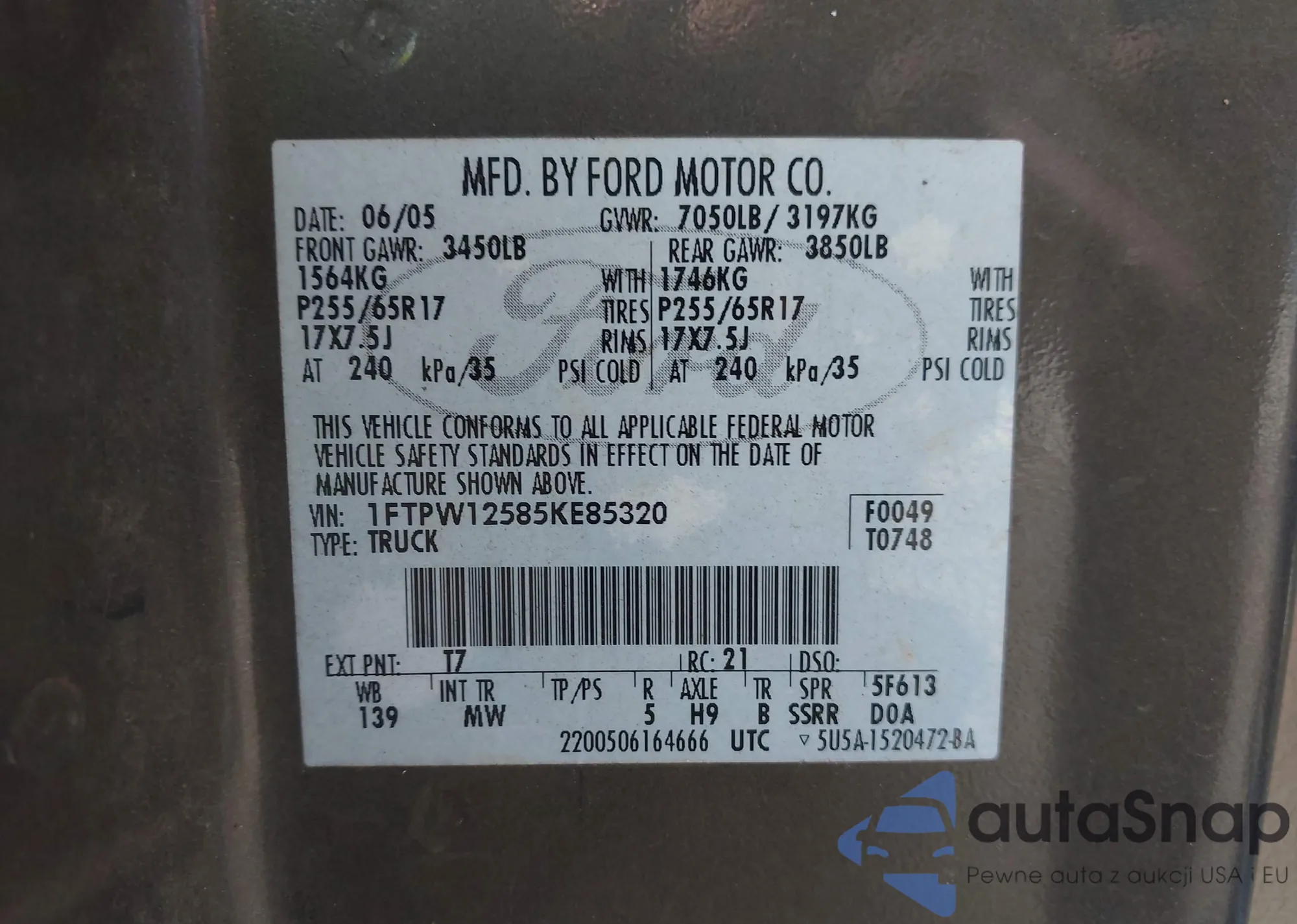 LOT: 43156994 VIN: 1FTPW12585KE85320