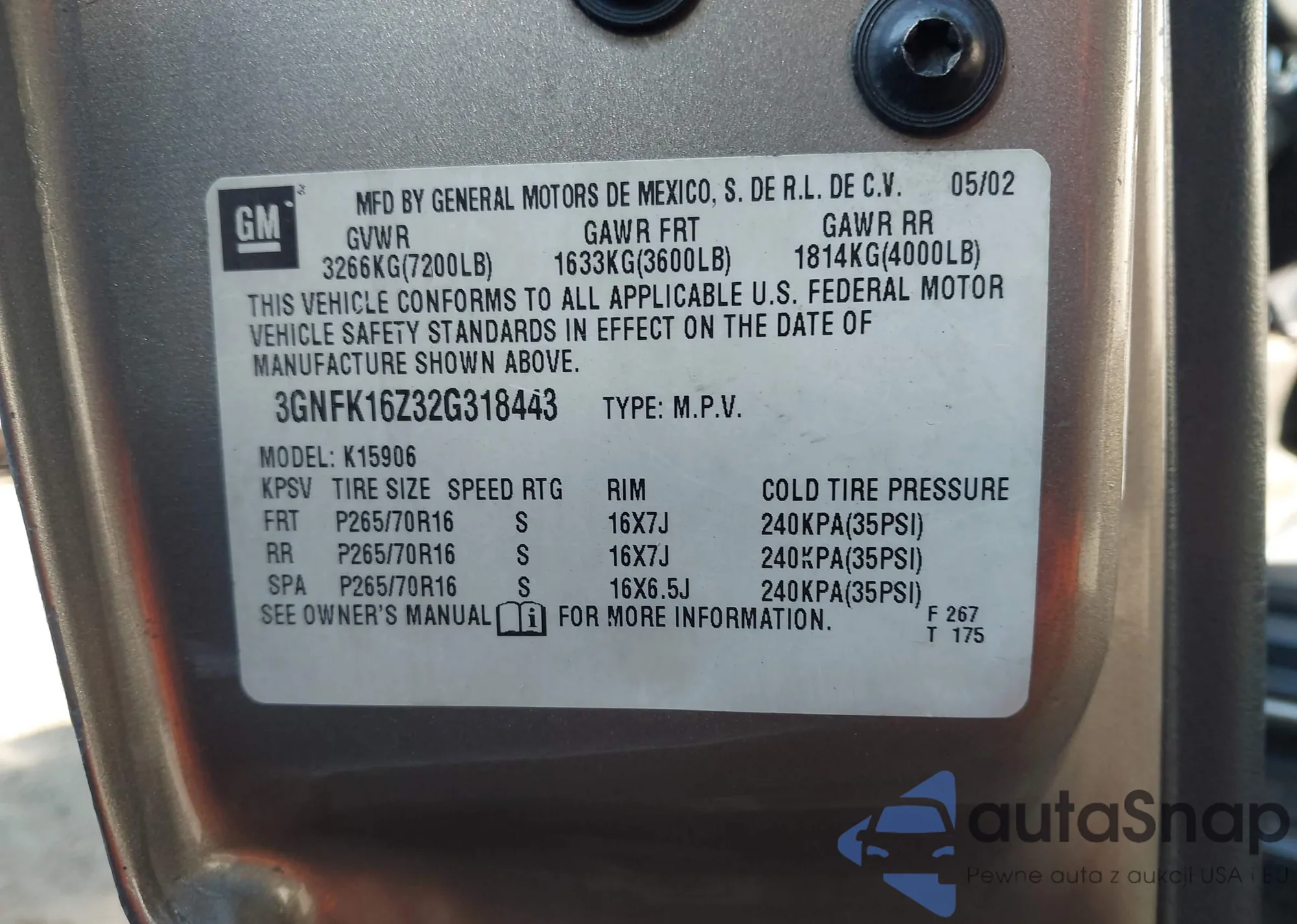 LOT: 43160840 VIN: 3GNFK16Z32G318443