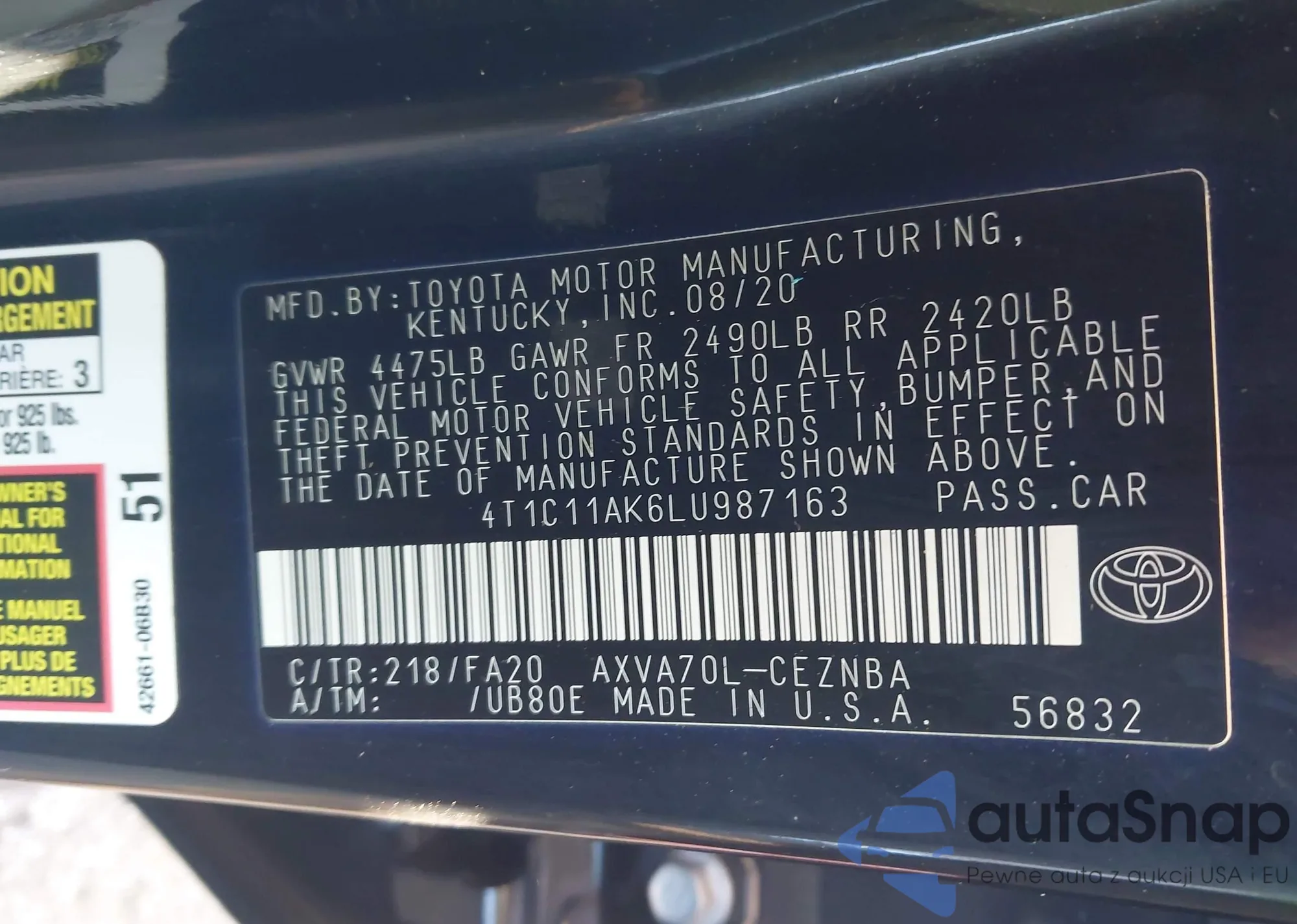 LOT: 43088070 VIN: 4T1C11AK6LU987163