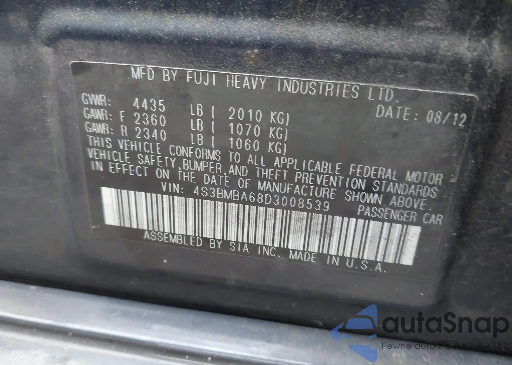 • VIN 4S3BMBA68D3008539