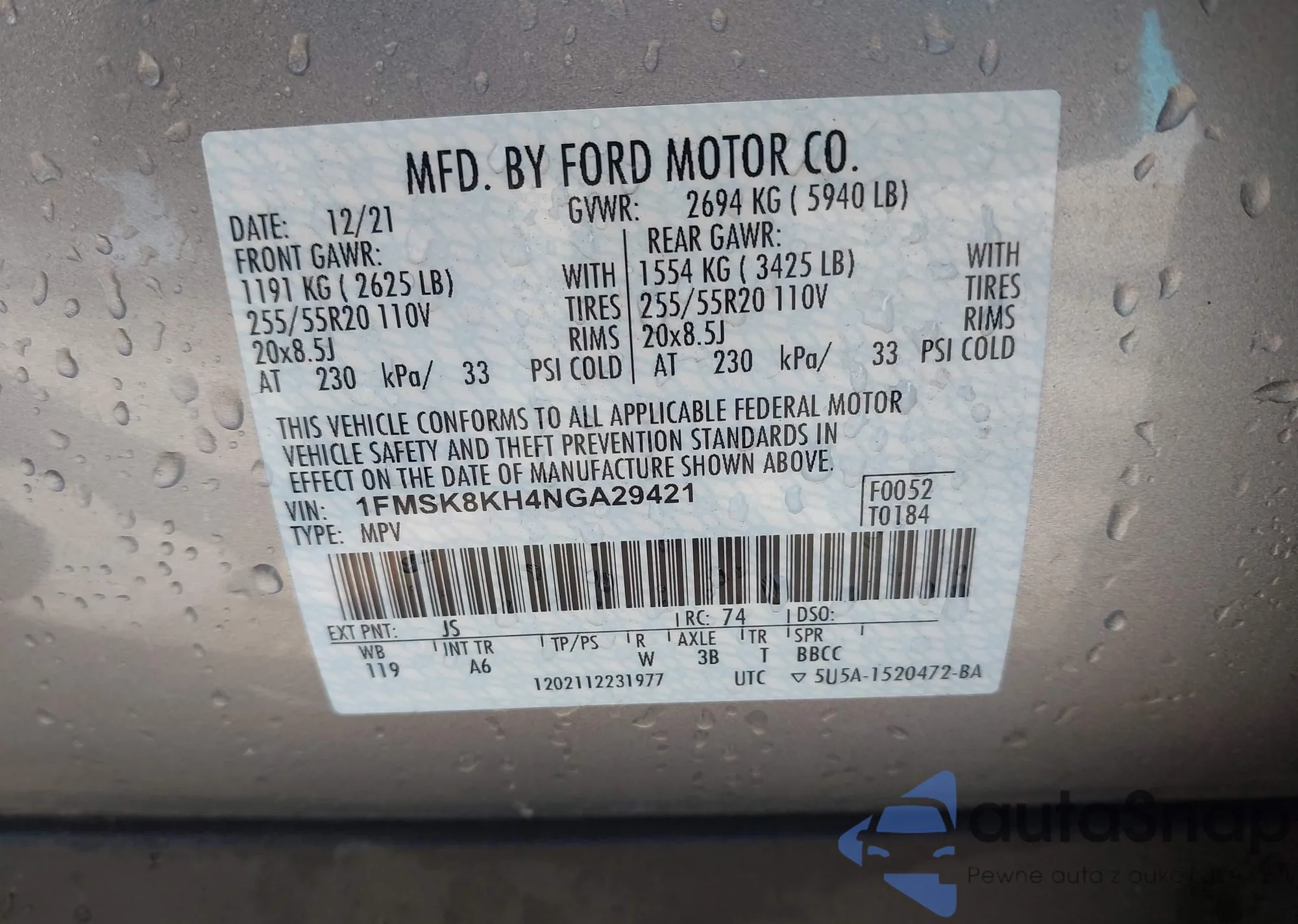 • VIN 1FMSK8KH4NGA29421