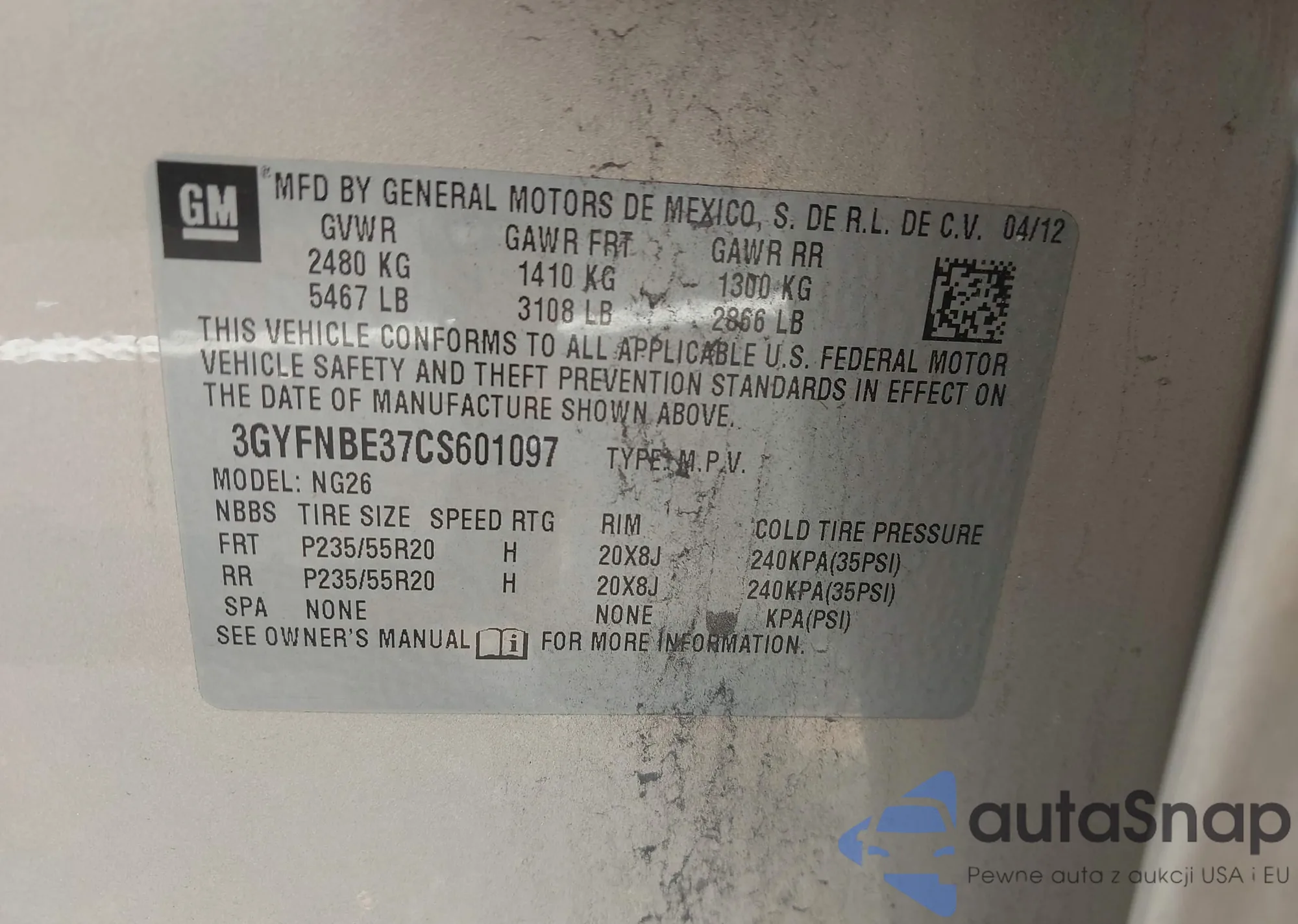 LOT: 42993538 VIN: 3GYFNBE37CS601097