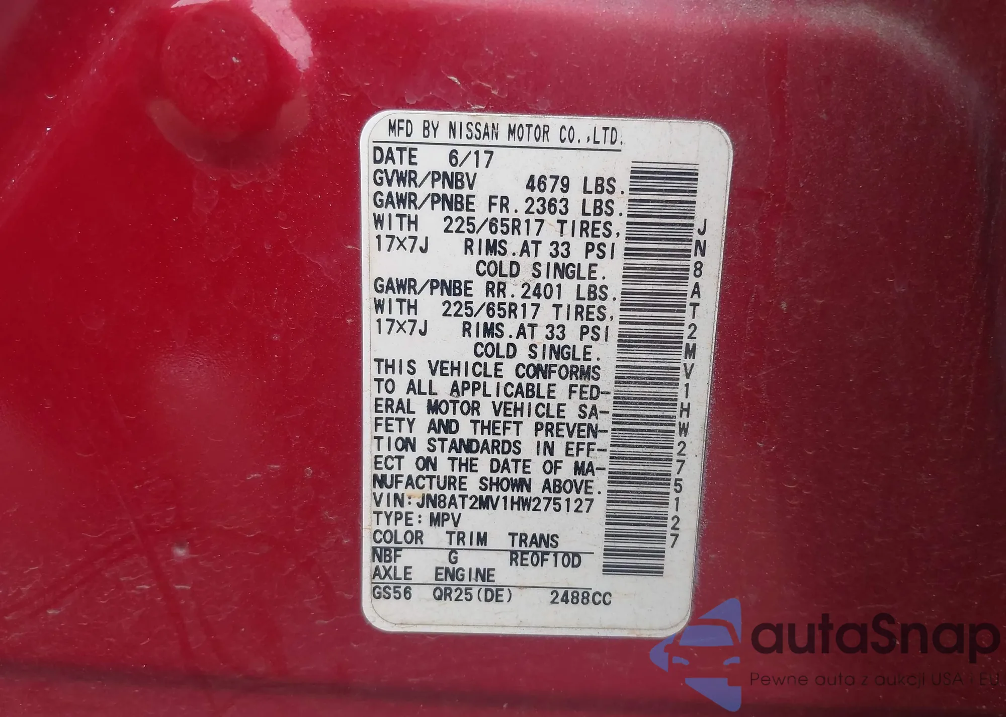 LOT: 42288743 VIN: JN8AT2MV1HW275127