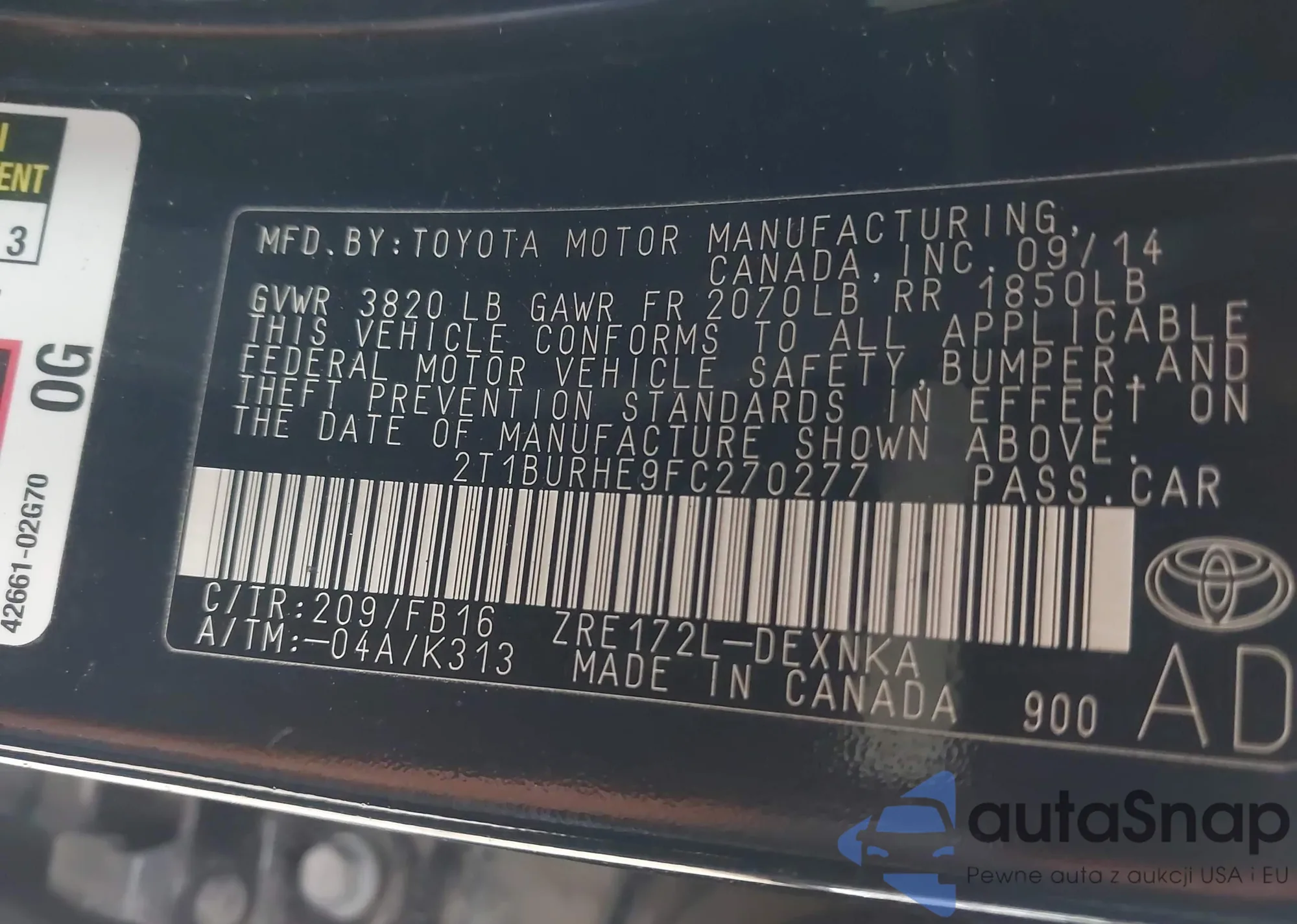 2015 Toyota Corolla L/Le/Le Pls/Prm/S/S Pls z USA, uszkodzony, nr VIN 2T1BURHE9FC270277