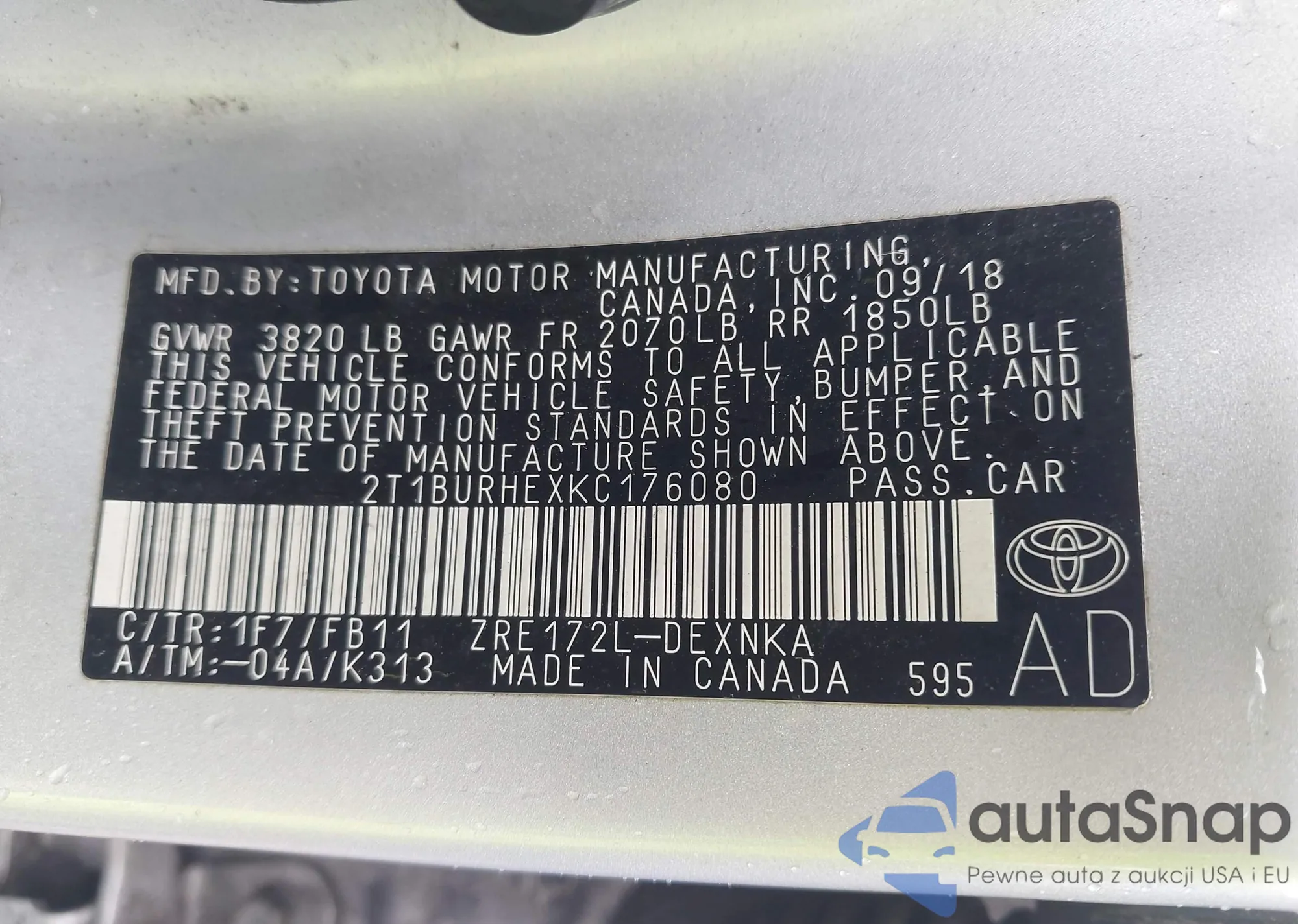LOT: 43192394 VIN: 2T1BURHEXKC176080