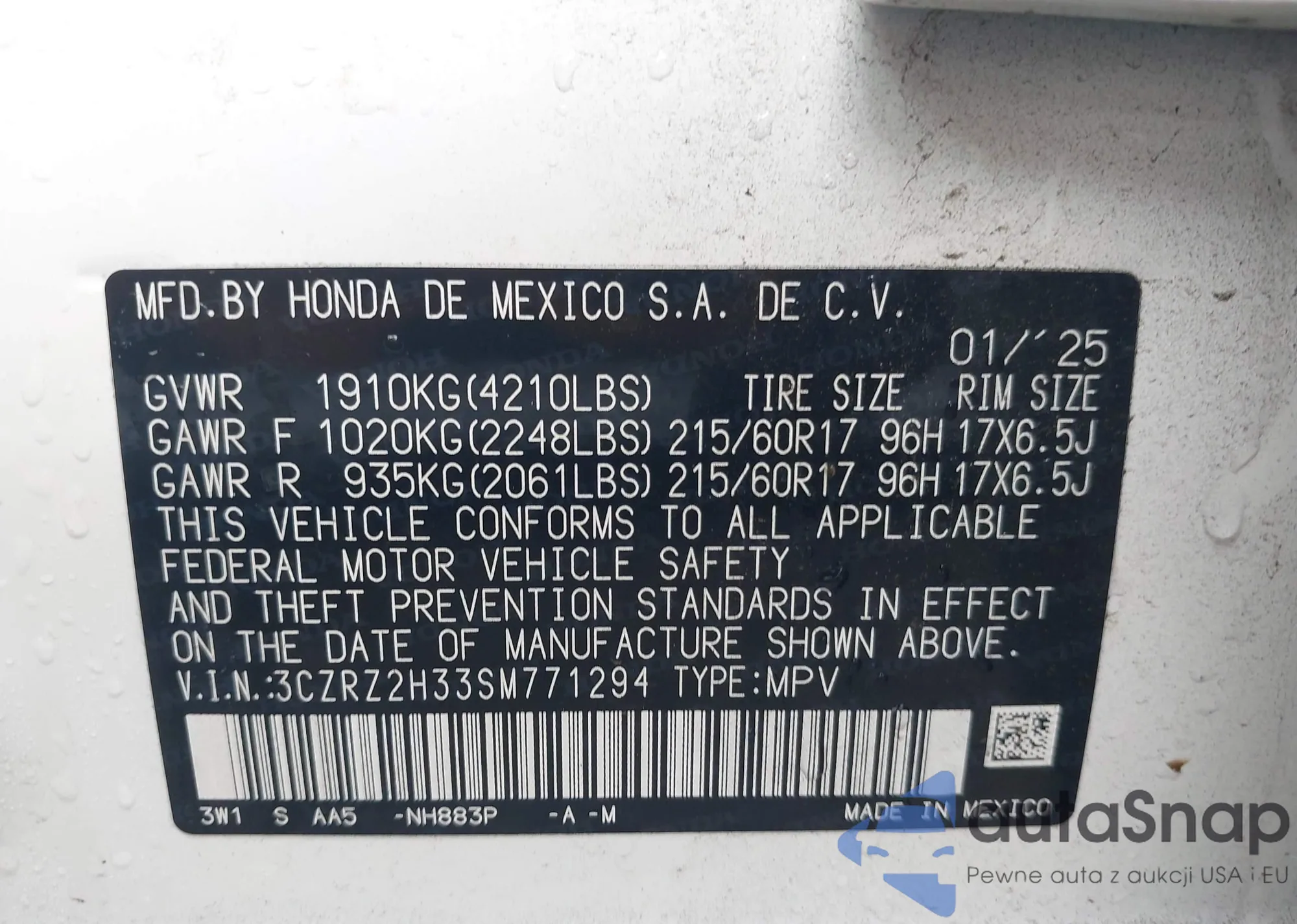 2025 Honda Hr-V Awd Lx z USA, uszkodzony, nr VIN 3CZRZ2H33SM771294