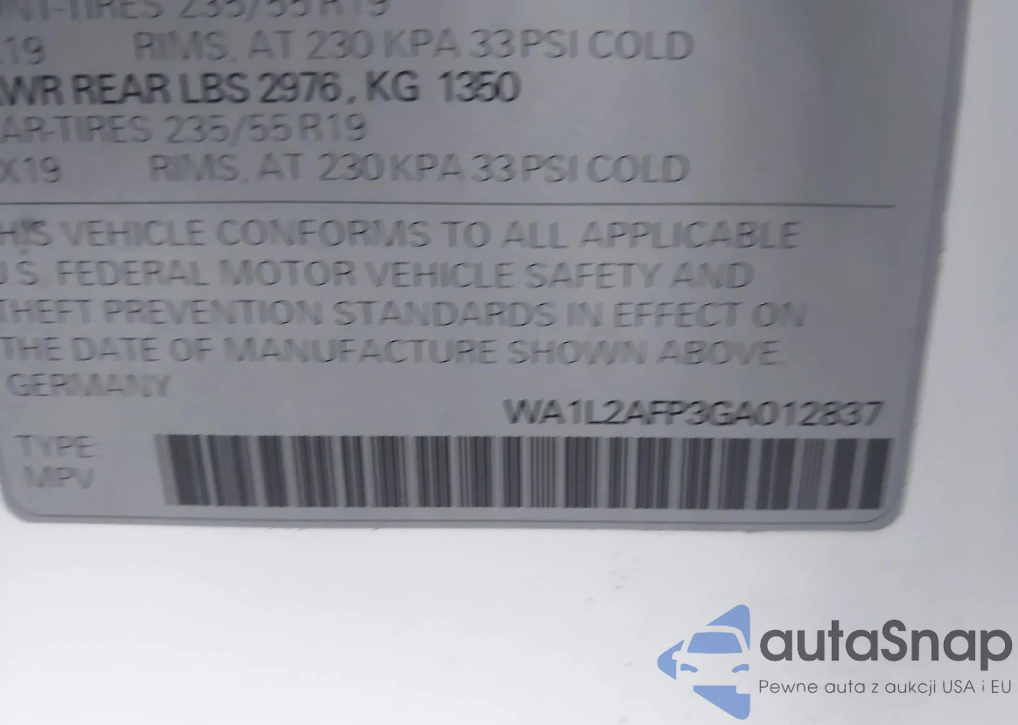 LOT: 43349939 VIN: WA1L2AFP3GA012837