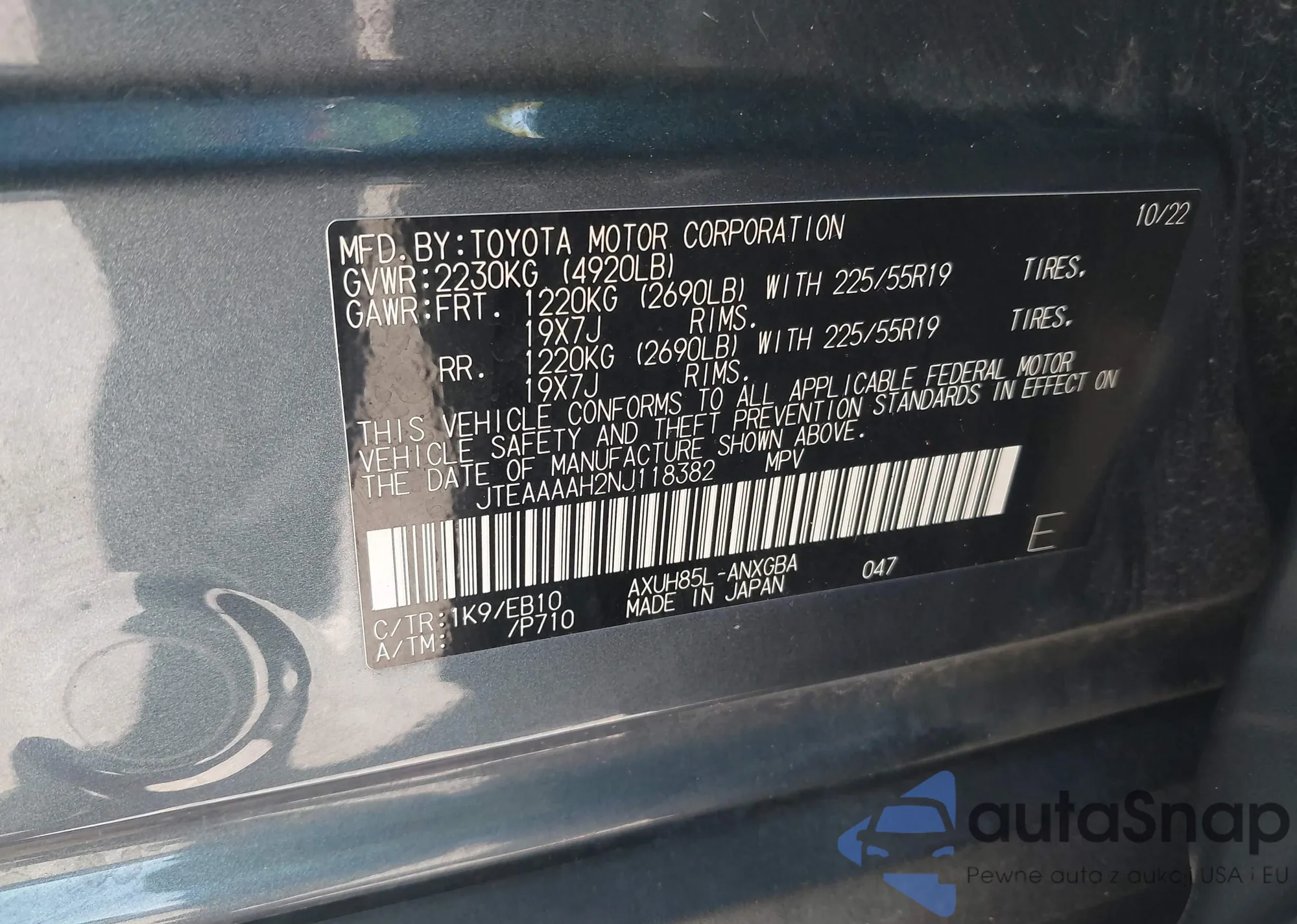 • VIN JTEAAAAH2NJ118382