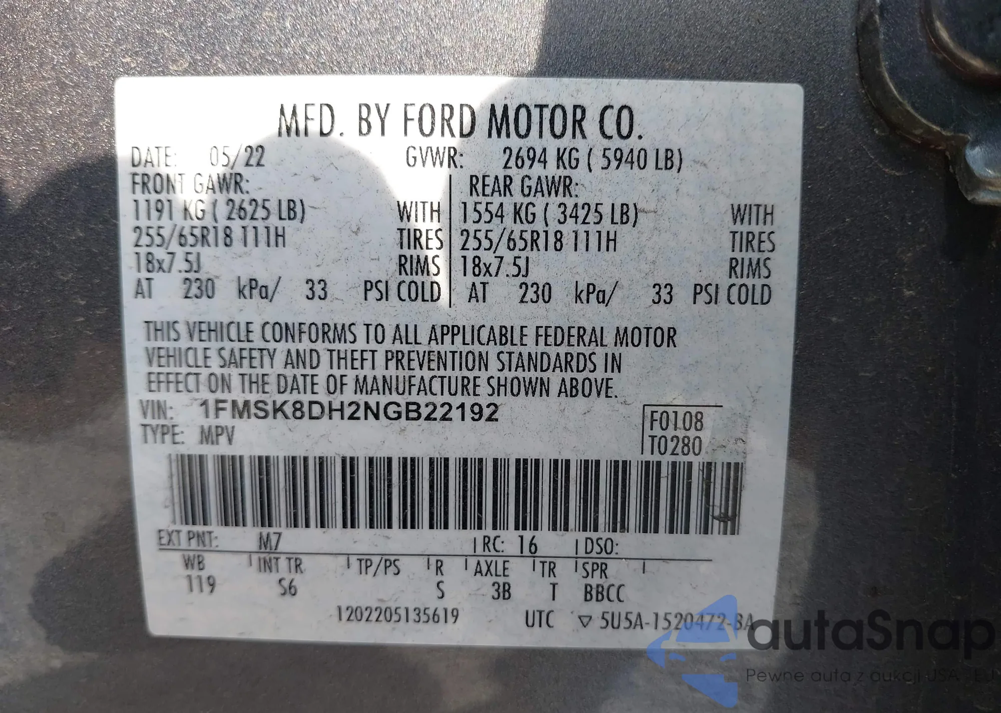 • VIN 1FMSK8DH2NGB22192